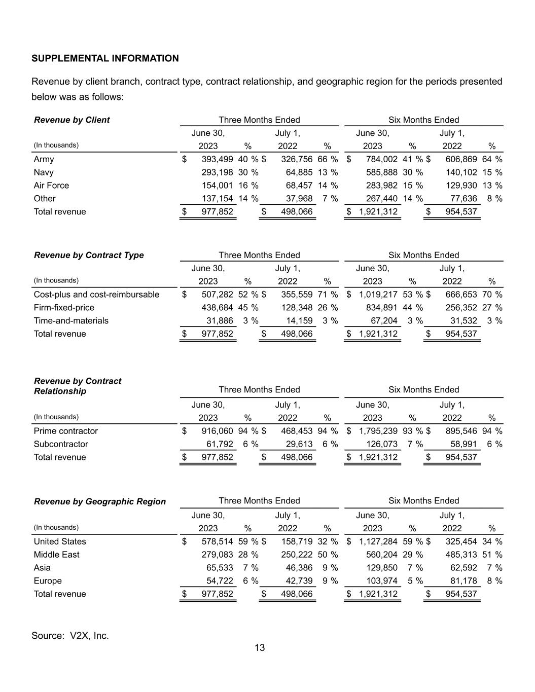 13 SUPPLEMENTAL INFORMATION Revenue by client branch, contract type, contract relationship, and geographic region for the periods presented below was as follows: Revenue by Client Three Months Ended Six Months Ended June 30, July 1, June 30, July 1, (In thousands) 2023 % 2022 % 2023 % 2022 % Army $ 393,499 40 % $ 326,756 66 % $ 784,002 41 % $ 606,869 64 % Navy 293,198 30 % 64,885 13 % 585,888 30 % 140,102 15 % Air Force 154,001 16 % 68,457 14 % 283,982 15 % 129,930 13 % Other 137,154 14 % 37,968 7 % 267,440 14 % 77,636 8 % Total revenue $ 977,852 $ 498,066 $ 1,921,312 $ 954,537 Revenue by Contract Type Three Months Ended Six Months Ended June 30, July 1, June 30, July 1, (In thousands) 2023 % 2022 % 2023 % 2022 % Cost-plus and cost-reimbursable $ 507,282 52 % $ 355,559 71 % $ 1,019,217 53 % $ 666,653 70 % Firm-fixed-price 438,684 45 % 128,348 26 % 834,891 44 % 256,352 27 % Time-and-materials 31,886 3 % 14,159 3 % 67,204 3 % 31,532 3 % Total revenue $ 977,852 $ 498,066 $ 1,921,312 $ 954,537 Revenue by Contract Relationship Three Months Ended Six Months Ended June 30, July 1, June 30, July 1, (In thousands) 2023 % 2022 % 2023 % 2022 % Prime contractor $ 916,060 94 % $ 468,453 94 % $ 1,795,239 93 % $ 895,546 94 % Subcontractor 61,792 6 % 29,613 6 % 126,073 7 % 58,991 6 % Total revenue $ 977,852 $ 498,066 $ 1,921,312 $ 954,537 Revenue by Geographic Region Three Months Ended Six Months Ended June 30, July 1, June 30, July 1, (In thousands) 2023 % 2022 % 2023 % 2022 % United States $ 578,514 59 % $ 158,719 32 % $ 1,127,284 59 % $ 325,454 34 % Middle East 279,083 28 % 250,222 50 % 560,204 29 % 485,313 51 % Asia 65,533 7 % 46,386 9 % 129,850 7 % 62,592 7 % Europe 54,722 6 % 42,739 9 % 103,974 5 % 81,178 8 % Total revenue $ 977,852 $ 498,066 $ 1,921,312 $ 954,537 Source: V2X, Inc.