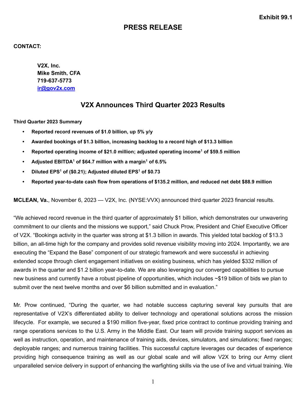 1 Exhibit 99.1 PRESS RELEASE CONTACT: V2X, Inc. Mike Smith, CFA 719-637-5773 ir@gov2x.com V2X Announces Third Quarter 2023 Results Third Quarter 2023 Summary • Reported record revenues of $1.0 billion, up 5% y/y • Awarded bookings of $1.3 billion, increasing backlog to a record high of $13.3 billion • Reported operating income of $21.0 million; adjusted operating income1 of $59.5 million • Adjusted EBITDA1 of $64.7 million with a margin1 of 6.5% • Diluted EPS1 of ($0.21); Adjusted diluted EPS1 of $0.73 • Reported year-to-date cash flow from operations of $135.2 million, and reduced net debt $88.9 million MCLEAN, Va., November 6, 2023 — V2X, Inc. (NYSE:VVX) announced third quarter 2023 financial results. “We achieved record revenue in the third quarter of approximately $1 billion, which demonstrates our unwavering commitment to our clients and the missions we support,” said Chuck Prow, President and Chief Executive Officer of V2X. “Bookings activity in the quarter was strong at $1.3 billion in awards. This yielded total backlog of $13.3 billion, an all-time high for the company and provides solid revenue visibility moving into 2024. Importantly, we are executing the “Expand the Base” component of our strategic framework and were successful in achieving extended scope through client engagement initiatives on existing business, which has yielded $332 million of awards in the quarter and $1.2 billion year-to-date. We are also leveraging our converged capabilities to pursue new business and currently have a robust pipeline of opportunities, which includes ~$19 billion of bids we plan to submit over the next twelve months and over $6 billion submitted and in evaluation.” Mr. Prow continued, “During the quarter, we had notable success capturing several key pursuits that are representative of V2X’s differentiated ability to deliver technology and operational solutions across the mission lifecycle. For example, we secured a $190 million five-year, fixed price contract to continue providing training and range operations services to the U.S. Army in the Middle East. Our team will provide training support services as well as instruction, operation, and maintenance of training aids, devices, simulators, and simulations; fixed ranges; deployable ranges; and numerous training facilities. This successful capture leverages our decades of experience providing high consequence training as well as our global scale and will allow V2X to bring our Army client unparalleled service delivery in support of enhancing the warfighting skills via the use of live and virtual training. We