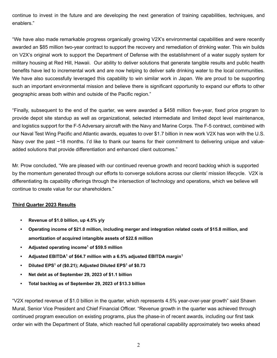 2 continue to invest in the future and are developing the next generation of training capabilities, techniques, and enablers.” “We have also made remarkable progress organically growing V2X’s environmental capabilities and were recently awarded an $85 million two-year contract to support the recovery and remediation of drinking water. This win builds on V2X’s original work to support the Department of Defense with the establishment of a water supply system for military housing at Red Hill, Hawaii. Our ability to deliver solutions that generate tangible results and public health benefits have led to incremental work and are now helping to deliver safe drinking water to the local communities. We have also successfully leveraged this capability to win similar work in Japan. We are proud to be supporting such an important environmental mission and believe there is significant opportunity to expand our efforts to other geographic areas both within and outside of the Pacific region.” “Finally, subsequent to the end of the quarter, we were awarded a $458 million five-year, fixed price program to provide depot site standup as well as organizational, selected intermediate and limited depot level maintenance, and logistics support for the F-5 Adversary aircraft with the Navy and Marine Corps. The F-5 contract, combined with our Naval Test Wing Pacific and Atlantic awards, equates to over $1.7 billion in new work V2X has won with the U.S. Navy over the past ~18 months. I’d like to thank our teams for their commitment to delivering unique and value- added solutions that provide differentiation and enhanced client outcomes.” Mr. Prow concluded, “We are pleased with our continued revenue growth and record backlog which is supported by the momentum generated through our efforts to converge solutions across our clients’ mission lifecycle. V2X is differentiating its capability offerings through the intersection of technology and operations, which we believe will continue to create value for our shareholders.” Third Quarter 2023 Results • Revenue of $1.0 billion, up 4.5% y/y • Operating income of $21.0 million, including merger and integration related costs of $15.8 million, and amortization of acquired intangible assets of $22.6 million • Adjusted operating income1 of $59.5 million • Adjusted EBITDA1 of $64.7 million with a 6.5% adjusted EBITDA margin1 • Diluted EPS1 of ($0.21); Adjusted Diluted EPS1 of $0.73 • Net debt as of September 29, 2023 of $1.1 billion • Total backlog as of September 29, 2023 of $13.3 billion “V2X reported revenue of $1.0 billion in the quarter, which represents 4.5% year-over-year growth” said Shawn Mural, Senior Vice President and Chief Financial Officer. “Revenue growth in the quarter was achieved through continued program execution on existing programs, plus the phase-in of recent awards, including our first task order win with the Department of State, which reached full operational capability approximately two weeks ahead