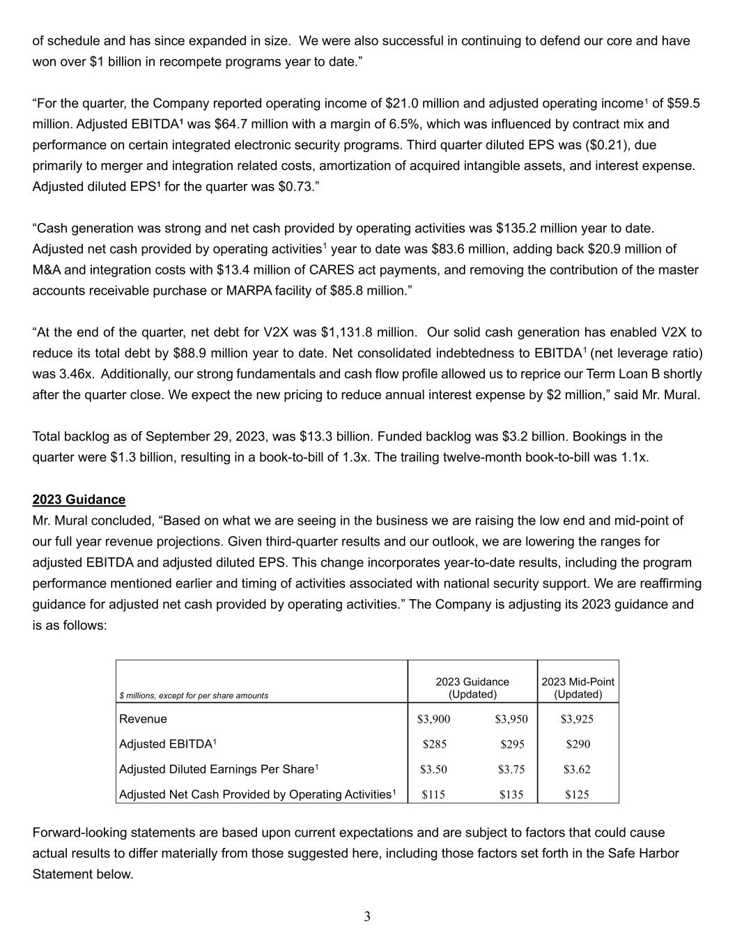 3 of schedule and has since expanded in size. We were also successful in continuing to defend our core and have won over $1 billion in recompete programs year to date.” “For the quarter, the Company reported operating income of $21.0 million and adjusted operating income1 of $59.5 million. Adjusted EBITDA1 was $64.7 million with a margin of 6.5%, which was influenced by contract mix and performance on certain integrated electronic security programs. Third quarter diluted EPS was ($0.21), due primarily to merger and integration related costs, amortization of acquired intangible assets, and interest expense. Adjusted diluted EPS1 for the quarter was $0.73.” “Cash generation was strong and net cash provided by operating activities was $135.2 million year to date. Adjusted net cash provided by operating activities1 year to date was $83.6 million, adding back $20.9 million of M&A and integration costs with $13.4 million of CARES act payments, and removing the contribution of the master accounts receivable purchase or MARPA facility of $85.8 million.” “At the end of the quarter, net debt for V2X was $1,131.8 million. Our solid cash generation has enabled V2X to reduce its total debt by $88.9 million year to date. Net consolidated indebtedness to EBITDA1 (net leverage ratio) was 3.46x. Additionally, our strong fundamentals and cash flow profile allowed us to reprice our Term Loan B shortly after the quarter close. We expect the new pricing to reduce annual interest expense by $2 million,” said Mr. Mural. Total backlog as of September 29, 2023, was $13.3 billion. Funded backlog was $3.2 billion. Bookings in the quarter were $1.3 billion, resulting in a book-to-bill of 1.3x. The trailing twelve-month book-to-bill was 1.1x. 2023 Guidance Mr. Mural concluded, “Based on what we are seeing in the business we are raising the low end and mid-point of our full year revenue projections. Given third-quarter results and our outlook, we are lowering the ranges for adjusted EBITDA and adjusted diluted EPS. This change incorporates year-to-date results, including the program performance mentioned earlier and timing of activities associated with national security support. We are reaffirming guidance for adjusted net cash provided by operating activities.” The Company is adjusting its 2023 guidance and is as follows: $ millions, except for per share amounts 2023 Guidance (Updated) 2023 Mid-Point (Updated) Revenue $3,900 $3,950 $3,925 Adjusted EBITDA1 $285 $295 $290 Adjusted Diluted Earnings Per Share1 $3.50 $3.75 $3.62 Adjusted Net Cash Provided by Operating Activities1 $115 $135 $125 Forward-looking statements are based upon current expectations and are subject to factors that could cause actual results to differ materially from those suggested here, including those factors set forth in the Safe Harbor Statement below.