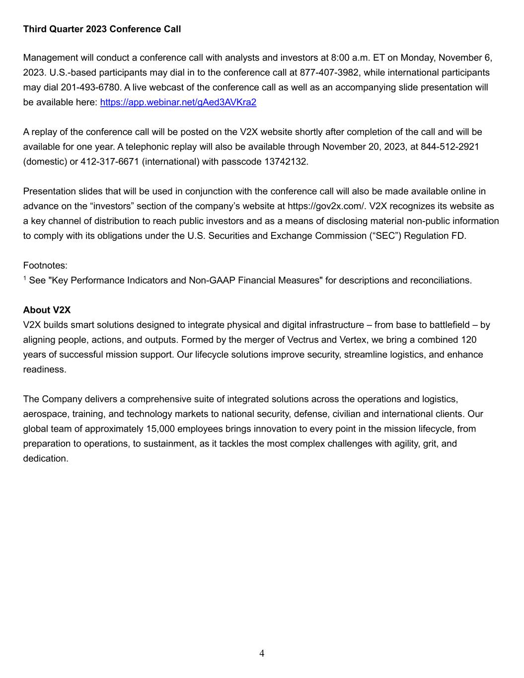 4 Third Quarter 2023 Conference Call Management will conduct a conference call with analysts and investors at 8:00 a.m. ET on Monday, November 6, 2023. U.S.-based participants may dial in to the conference call at 877-407-3982, while international participants may dial 201-493-6780. A live webcast of the conference call as well as an accompanying slide presentation will be available here: https://app.webinar.net/gAed3AVKra2 A replay of the conference call will be posted on the V2X website shortly after completion of the call and will be available for one year. A telephonic replay will also be available through November 20, 2023, at 844-512-2921 (domestic) or 412-317-6671 (international) with passcode 13742132. Presentation slides that will be used in conjunction with the conference call will also be made available online in advance on the “investors” section of the company’s website at https://gov2x.com/. V2X recognizes its website as a key channel of distribution to reach public investors and as a means of disclosing material non-public information to comply with its obligations under the U.S. Securities and Exchange Commission (“SEC”) Regulation FD. Footnotes: 1 See "Key Performance Indicators and Non-GAAP Financial Measures" for descriptions and reconciliations. About V2X V2X builds smart solutions designed to integrate physical and digital infrastructure – from base to battlefield – by aligning people, actions, and outputs. Formed by the merger of Vectrus and Vertex, we bring a combined 120 years of successful mission support. Our lifecycle solutions improve security, streamline logistics, and enhance readiness. The Company delivers a comprehensive suite of integrated solutions across the operations and logistics, aerospace, training, and technology markets to national security, defense, civilian and international clients. Our global team of approximately 15,000 employees brings innovation to every point in the mission lifecycle, from preparation to operations, to sustainment, as it tackles the most complex challenges with agility, grit, and dedication.