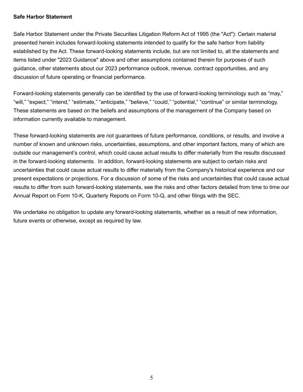 5 Safe Harbor Statement Safe Harbor Statement under the Private Securities Litigation Reform Act of 1995 (the "Act"): Certain material presented herein includes forward-looking statements intended to qualify for the safe harbor from liability established by the Act. These forward-looking statements include, but are not limited to, all the statements and items listed under "2023 Guidance" above and other assumptions contained therein for purposes of such guidance, other statements about our 2023 performance outlook, revenue, contract opportunities, and any discussion of future operating or financial performance. Forward-looking statements generally can be identified by the use of forward-looking terminology such as “may,” “will,” “expect,” “intend,” “estimate,” “anticipate,” “believe,” “could,” “potential,” “continue” or similar terminology. These statements are based on the beliefs and assumptions of the management of the Company based on information currently available to management. These forward-looking statements are not guarantees of future performance, conditions, or results, and involve a number of known and unknown risks, uncertainties, assumptions, and other important factors, many of which are outside our management’s control, which could cause actual results to differ materially from the results discussed in the forward-looking statements. In addition, forward-looking statements are subject to certain risks and uncertainties that could cause actual results to differ materially from the Company's historical experience and our present expectations or projections. For a discussion of some of the risks and uncertainties that could cause actual results to differ from such forward-looking statements, see the risks and other factors detailed from time to time our Annual Report on Form 10-K, Quarterly Reports on Form 10-Q, and other filings with the SEC. We undertake no obligation to update any forward-looking statements, whether as a result of new information, future events or otherwise, except as required by law.
