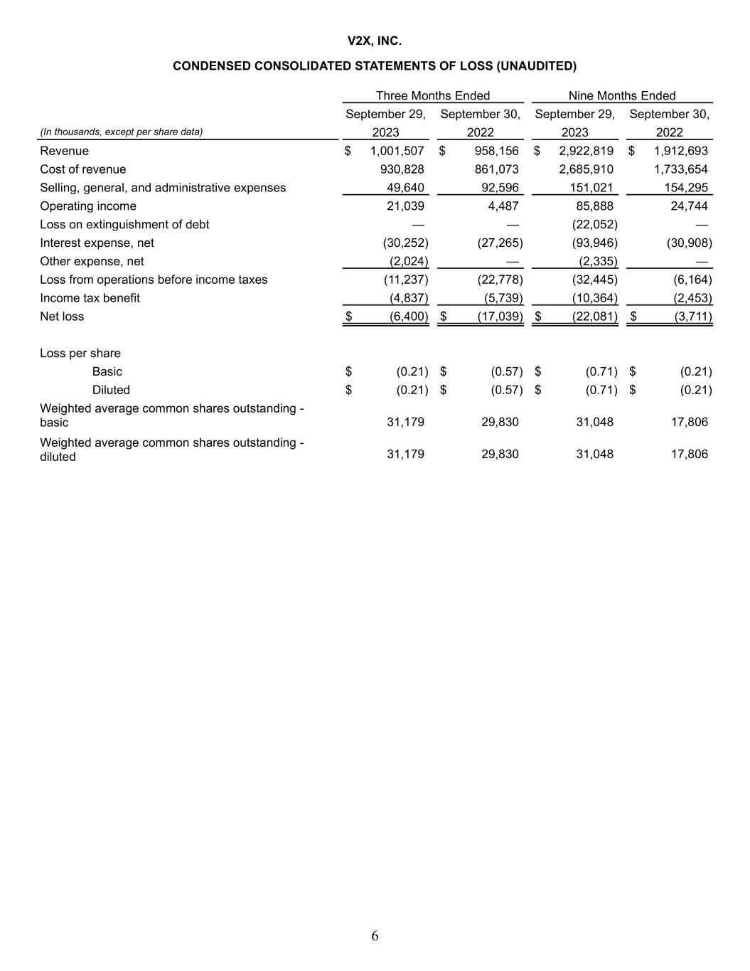 6 V2X, INC. CONDENSED CONSOLIDATED STATEMENTS OF LOSS (UNAUDITED) Three Months Ended Nine Months Ended September 29, September 30, September 29, September 30, (In thousands, except per share data) 2023 2022 2023 2022 Revenue $ 1,001,507 $ 958,156 $ 2,922,819 $ 1,912,693 Cost of revenue 930,828 861,073 2,685,910 1,733,654 Selling, general, and administrative expenses 49,640 92,596 151,021 154,295 Operating income 21,039 4,487 85,888 24,744 Loss on extinguishment of debt — — (22,052) — Interest expense, net (30,252) (27,265) (93,946) (30,908) Other expense, net (2,024) — (2,335) — Loss from operations before income taxes (11,237) (22,778) (32,445) (6,164) Income tax benefit (4,837) (5,739) (10,364) (2,453) Net loss $ (6,400) $ (17,039) $ (22,081) $ (3,711) Loss per share Basic $ (0.21) $ (0.57) $ (0.71) $ (0.21) Diluted $ (0.21) $ (0.57) $ (0.71) $ (0.21) Weighted average common shares outstanding - basic 31,179 29,830 31,048 17,806 Weighted average common shares outstanding - diluted 31,179 29,830 31,048 17,806