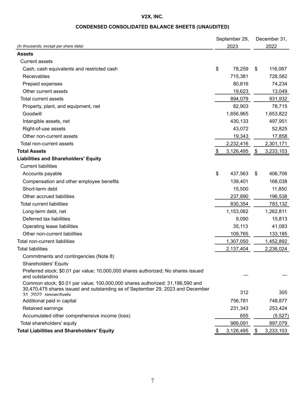 7 V2X, INC. CONDENSED CONSOLIDATED BALANCE SHEETS (UNAUDITED) September 29, December 31, (In thousands, except per share data) 2023 2022 Assets Current assets Cash, cash equivalents and restricted cash $ 78,259 $ 116,067 Receivables 715,381 728,582 Prepaid expenses 80,816 74,234 Other current assets 19,623 13,049 Total current assets 894,079 931,932 Property, plant, and equipment, net 82,903 78,715 Goodwill 1,656,965 1,653,822 Intangible assets, net 430,133 497,951 Right-of-use assets 43,072 52,825 Other non-current assets 19,343 17,858 Total non-current assets 2,232,416 2,301,171 Total Assets $ 3,126,495 $ 3,233,103 Liabilities and Shareholders' Equity Current liabilities Accounts payable $ 437,563 $ 406,706 Compensation and other employee benefits 139,401 168,038 Short-term debt 15,500 11,850 Other accrued liabilities 237,890 196,538 Total current liabilities 830,354 783,132 Long-term debt, net 1,153,082 1,262,811 Deferred tax liabilities 9,090 15,813 Operating lease liabilities 35,113 41,083 Other non-current liabilities 109,765 133,185 Total non-current liabilities 1,307,050 1,452,892 Total liabilities 2,137,404 2,236,024 Commitments and contingencies (Note 8) Shareholders' Equity Preferred stock; $0.01 par value; 10,000,000 shares authorized; No shares issued and outstanding — — Common stock; $0.01 par value; 100,000,000 shares authorized; 31,186,590 and 30,470,475 shares issued and outstanding as of September 29, 2023 and December 31, 2022, respectively 312 305 Additional paid in capital 756,781 748,877 Retained earnings 231,343 253,424 Accumulated other comprehensive income (loss) 655 (5,527) Total shareholders' equity 989,091 997,079 Total Liabilities and Shareholders' Equity $ 3,126,495 $ 3,233,103