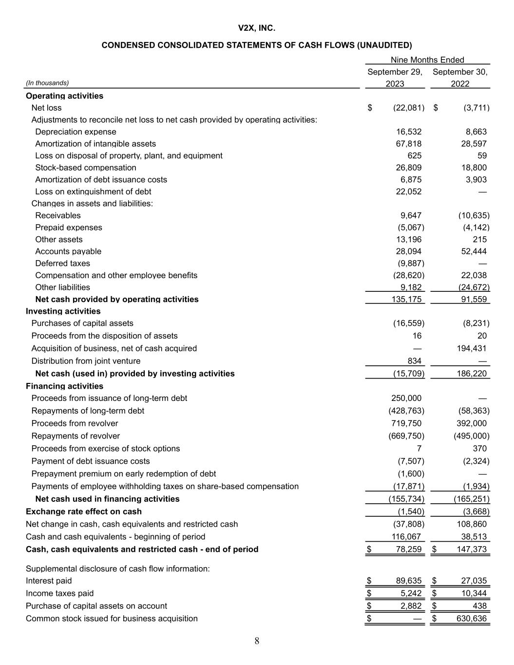 8 V2X, INC. CONDENSED CONSOLIDATED STATEMENTS OF CASH FLOWS (UNAUDITED) Nine Months Ended September 29, September 30, (In thousands) 2023 2022 Operating activities Net loss $ (22,081) $ (3,711) Adjustments to reconcile net loss to net cash provided by operating activities: Depreciation expense 16,532 8,663 Amortization of intangible assets 67,818 28,597 Loss on disposal of property, plant, and equipment 625 59 Stock-based compensation 26,809 18,800 Amortization of debt issuance costs 6,875 3,903 Loss on extinguishment of debt 22,052 — Changes in assets and liabilities: Receivables 9,647 (10,635) Prepaid expenses (5,067) (4,142) Other assets 13,196 215 Accounts payable 28,094 52,444 Deferred taxes (9,887) — Compensation and other employee benefits (28,620) 22,038 Other liabilities 9,182 (24,672) Net cash provided by operating activities 135,175 91,559 Investing activities Purchases of capital assets (16,559) (8,231) Proceeds from the disposition of assets 16 20 Acquisition of business, net of cash acquired — 194,431 Distribution from joint venture 834 — Net cash (used in) provided by investing activities (15,709) 186,220 Financing activities Proceeds from issuance of long-term debt 250,000 — Repayments of long-term debt (428,763) (58,363) Proceeds from revolver 719,750 392,000 Repayments of revolver (669,750) (495,000) Proceeds from exercise of stock options 7 370 Payment of debt issuance costs (7,507) (2,324) Prepayment premium on early redemption of debt (1,600) — Payments of employee withholding taxes on share-based compensation (17,871) (1,934) Net cash used in financing activities (155,734) (165,251) Exchange rate effect on cash (1,540) (3,668) Net change in cash, cash equivalents and restricted cash (37,808) 108,860 Cash and cash equivalents - beginning of period 116,067 38,513 Cash, cash equivalents and restricted cash - end of period $ 78,259 $ 147,373 Supplemental disclosure of cash flow information: Interest paid $ 89,635 $ 27,035 Income taxes paid $ 5,242 $ 10,344 Purchase of capital assets on account $ 2,882 $ 438 Common stock issued for business acquisition $ — $ 630,636