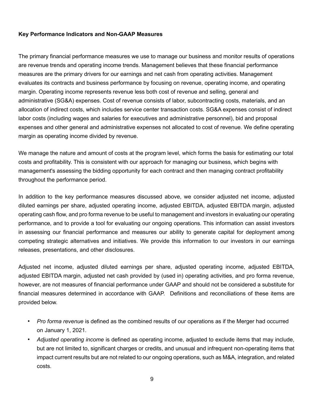 9 Key Performance Indicators and Non-GAAP Measures The primary financial performance measures we use to manage our business and monitor results of operations are revenue trends and operating income trends. Management believes that these financial performance measures are the primary drivers for our earnings and net cash from operating activities. Management evaluates its contracts and business performance by focusing on revenue, operating income, and operating margin. Operating income represents revenue less both cost of revenue and selling, general and administrative (SG&A) expenses. Cost of revenue consists of labor, subcontracting costs, materials, and an allocation of indirect costs, which includes service center transaction costs. SG&A expenses consist of indirect labor costs (including wages and salaries for executives and administrative personnel), bid and proposal expenses and other general and administrative expenses not allocated to cost of revenue. We define operating margin as operating income divided by revenue. We manage the nature and amount of costs at the program level, which forms the basis for estimating our total costs and profitability. This is consistent with our approach for managing our business, which begins with management's assessing the bidding opportunity for each contract and then managing contract profitability throughout the performance period. In addition to the key performance measures discussed above, we consider adjusted net income, adjusted diluted earnings per share, adjusted operating income, adjusted EBITDA, adjusted EBITDA margin, adjusted operating cash flow, and pro forma revenue to be useful to management and investors in evaluating our operating performance, and to provide a tool for evaluating our ongoing operations. This information can assist investors in assessing our financial performance and measures our ability to generate capital for deployment among competing strategic alternatives and initiatives. We provide this information to our investors in our earnings releases, presentations, and other disclosures. Adjusted net income, adjusted diluted earnings per share, adjusted operating income, adjusted EBITDA, adjusted EBITDA margin, adjusted net cash provided by (used in) operating activities, and pro forma revenue, however, are not measures of financial performance under GAAP and should not be considered a substitute for financial measures determined in accordance with GAAP. Definitions and reconciliations of these items are provided below. • Pro forma revenue is defined as the combined results of our operations as if the Merger had occurred on January 1, 2021. • Adjusted operating income is defined as operating income, adjusted to exclude items that may include, but are not limited to, significant charges or credits, and unusual and infrequent non-operating items that impact current results but are not related to our ongoing operations, such as M&A, integration, and related costs.