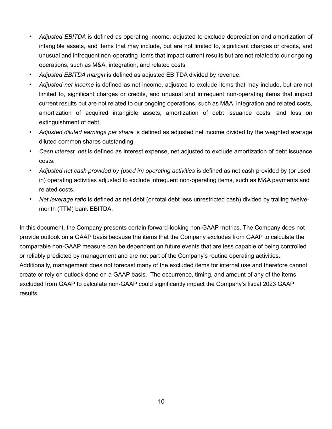 10 • Adjusted EBITDA is defined as operating income, adjusted to exclude depreciation and amortization of intangible assets, and items that may include, but are not limited to, significant charges or credits, and unusual and infrequent non-operating items that impact current results but are not related to our ongoing operations, such as M&A, integration, and related costs. • Adjusted EBITDA margin is defined as adjusted EBITDA divided by revenue. • Adjusted net income is defined as net income, adjusted to exclude items that may include, but are not limited to, significant charges or credits, and unusual and infrequent non-operating items that impact current results but are not related to our ongoing operations, such as M&A, integration and related costs, amortization of acquired intangible assets, amortization of debt issuance costs, and loss on extinguishment of debt. • Adjusted diluted earnings per share is defined as adjusted net income divided by the weighted average diluted common shares outstanding. • Cash interest, net is defined as interest expense, net adjusted to exclude amortization of debt issuance costs. • Adjusted net cash provided by (used in) operating activities is defined as net cash provided by (or used in) operating activities adjusted to exclude infrequent non-operating items, such as M&A payments and related costs. • Net leverage ratio is defined as net debt (or total debt less unrestricted cash) divided by trailing twelve- month (TTM) bank EBITDA. In this document, the Company presents certain forward-looking non-GAAP metrics. The Company does not provide outlook on a GAAP basis because the items that the Company excludes from GAAP to calculate the comparable non-GAAP measure can be dependent on future events that are less capable of being controlled or reliably predicted by management and are not part of the Company's routine operating activities. Additionally, management does not forecast many of the excluded items for internal use and therefore cannot create or rely on outlook done on a GAAP basis. The occurrence, timing, and amount of any of the items excluded from GAAP to calculate non-GAAP could significantly impact the Company's fiscal 2023 GAAP results.