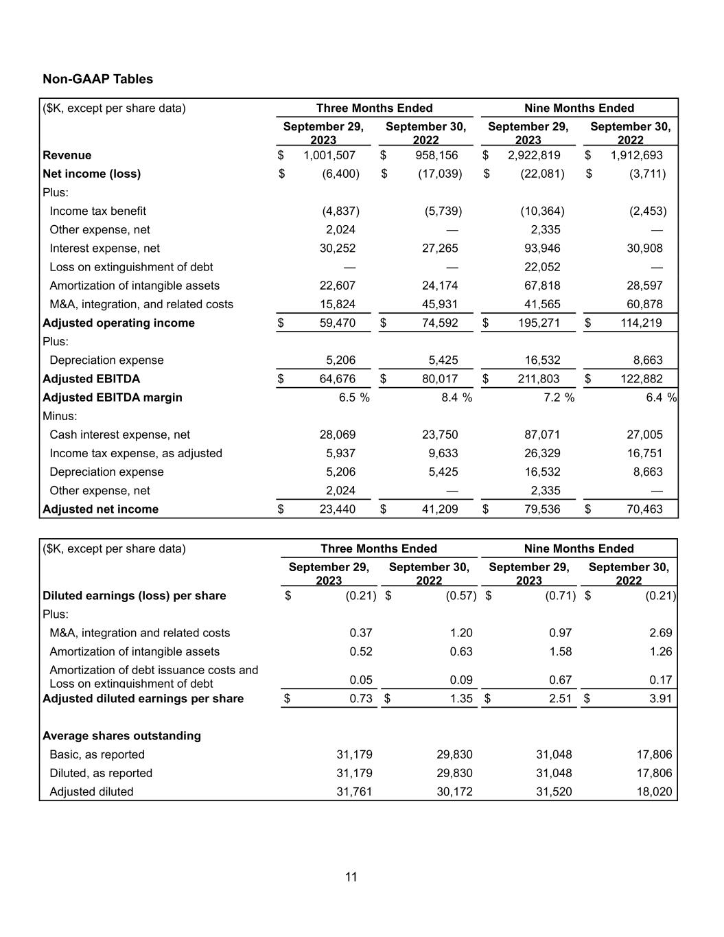11 Non-GAAP Tables ($K, except per share data) Three Months Ended Nine Months Ended September 29, 2023 September 30, 2022 September 29, 2023 September 30, 2022 Revenue $ 1,001,507 $ 958,156 $ 2,922,819 $ 1,912,693 Net income (loss) $ (6,400) $ (17,039) $ (22,081) $ (3,711) Plus: Income tax benefit (4,837) (5,739) (10,364) (2,453) Other expense, net 2,024 — 2,335 — Interest expense, net 30,252 27,265 93,946 30,908 Loss on extinguishment of debt — — 22,052 — Amortization of intangible assets 22,607 24,174 67,818 28,597 M&A, integration, and related costs 15,824 45,931 41,565 60,878 Adjusted operating income $ 59,470 $ 74,592 $ 195,271 $ 114,219 Plus: Depreciation expense 5,206 5,425 16,532 8,663 Adjusted EBITDA $ 64,676 $ 80,017 $ 211,803 $ 122,882 Adjusted EBITDA margin 6.5 % 8.4 % 7.2 % 6.4 % Minus: Cash interest expense, net 28,069 23,750 87,071 27,005 Income tax expense, as adjusted 5,937 9,633 26,329 16,751 Depreciation expense 5,206 5,425 16,532 8,663 Other expense, net 2,024 — 2,335 — Adjusted net income $ 23,440 $ 41,209 $ 79,536 $ 70,463 ($K, except per share data) Three Months Ended Nine Months Ended September 29, 2023 September 30, 2022 September 29, 2023 September 30, 2022 Diluted earnings (loss) per share $ (0.21) $ (0.57) $ (0.71) $ (0.21) Plus: M&A, integration and related costs 0.37 1.20 0.97 2.69 Amortization of intangible assets 0.52 0.63 1.58 1.26 Amortization of debt issuance costs and Loss on extinguishment of debt 0.05 0.09 0.67 0.17 Adjusted diluted earnings per share $ 0.73 $ 1.35 $ 2.51 $ 3.91 Average shares outstanding Basic, as reported 31,179 29,830 31,048 17,806 Diluted, as reported 31,179 29,830 31,048 17,806 Adjusted diluted 31,761 30,172 31,520 18,020