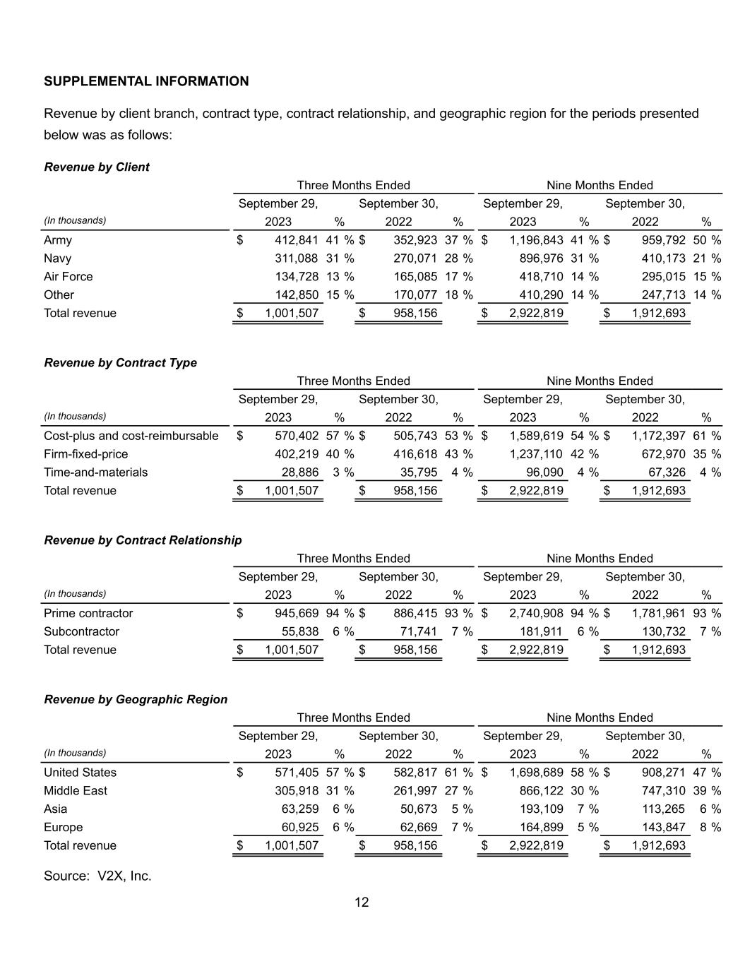 12 SUPPLEMENTAL INFORMATION Revenue by client branch, contract type, contract relationship, and geographic region for the periods presented below was as follows: Revenue by Client Three Months Ended Nine Months Ended September 29, September 30, September 29, September 30, (In thousands) 2023 % 2022 % 2023 % 2022 % Army $ 412,841 41 % $ 352,923 37 % $ 1,196,843 41 % $ 959,792 50 % Navy 311,088 31 % 270,071 28 % 896,976 31 % 410,173 21 % Air Force 134,728 13 % 165,085 17 % 418,710 14 % 295,015 15 % Other 142,850 15 % 170,077 18 % 410,290 14 % 247,713 14 % Total revenue $ 1,001,507 $ 958,156 $ 2,922,819 $ 1,912,693 Revenue by Contract Type Three Months Ended Nine Months Ended September 29, September 30, September 29, September 30, (In thousands) 2023 % 2022 % 2023 % 2022 % Cost-plus and cost-reimbursable $ 570,402 57 % $ 505,743 53 % $ 1,589,619 54 % $ 1,172,397 61 % Firm-fixed-price 402,219 40 % 416,618 43 % 1,237,110 42 % 672,970 35 % Time-and-materials 28,886 3 % 35,795 4 % 96,090 4 % 67,326 4 % Total revenue $ 1,001,507 $ 958,156 $ 2,922,819 $ 1,912,693 Revenue by Contract Relationship Three Months Ended Nine Months Ended September 29, September 30, September 29, September 30, (In thousands) 2023 % 2022 % 2023 % 2022 % Prime contractor $ 945,669 94 % $ 886,415 93 % $ 2,740,908 94 % $ 1,781,961 93 % Subcontractor 55,838 6 % 71,741 7 % 181,911 6 % 130,732 7 % Total revenue $ 1,001,507 $ 958,156 $ 2,922,819 $ 1,912,693 Revenue by Geographic Region Three Months Ended Nine Months Ended September 29, September 30, September 29, September 30, (In thousands) 2023 % 2022 % 2023 % 2022 % United States $ 571,405 57 % $ 582,817 61 % $ 1,698,689 58 % $ 908,271 47 % Middle East 305,918 31 % 261,997 27 % 866,122 30 % 747,310 39 % Asia 63,259 6 % 50,673 5 % 193,109 7 % 113,265 6 % Europe 60,925 6 % 62,669 7 % 164,899 5 % 143,847 8 % Total revenue $ 1,001,507 $ 958,156 $ 2,922,819 $ 1,912,693 Source: V2X, Inc.