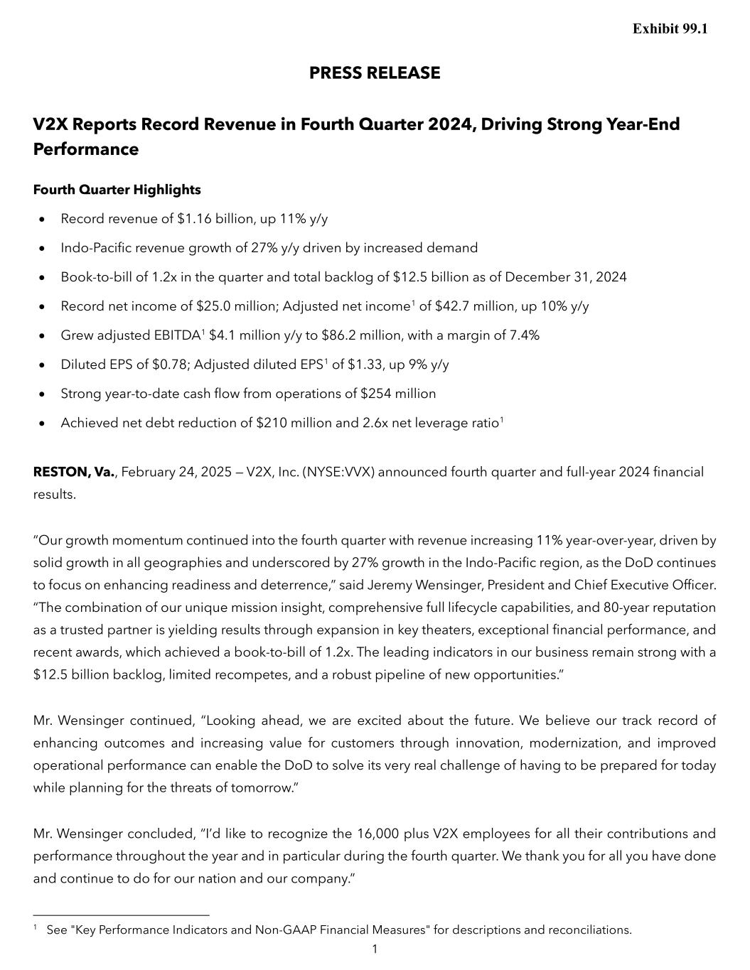 1 PRESS RELEASE V2X Reports Record Revenue in Fourth Quarter 2024, Driving Strong Year-End Performance Fourth Quarter Highlights  Record revenue of $1.16 billion, up 11% y/y  Indo-Pacific revenue growth of 27% y/y driven by increased demand  Book-to-bill of 1.2x in the quarter and total backlog of $12.5 billion as of December 31, 2024  Record net income of $25.0 million; Adjusted net income1 of $42.7 million, up 10% y/y  Grew adjusted EBITDA1 $4.1 million y/y to $86.2 million, with a margin of 7.4%  Diluted EPS of $0.78; Adjusted diluted EPS1 of $1.33, up 9% y/y  Strong year-to-date cash flow from operations of $254 million  Achieved net debt reduction of $210 million and 2.6x net leverage ratio1 RESTON, Va., February 24, 2025 — V2X, Inc. (NYSE:VVX) announced fourth quarter and full-year 2024 financial results. “Our growth momentum continued into the fourth quarter with revenue increasing 11% year-over-year, driven by solid growth in all geographies and underscored by 27% growth in the Indo-Pacific region, as the DoD continues to focus on enhancing readiness and deterrence,” said Jeremy Wensinger, President and Chief Executive Officer. “The combination of our unique mission insight, comprehensive full lifecycle capabilities, and 80-year reputation as a trusted partner is yielding results through expansion in key theaters, exceptional financial performance, and recent awards, which achieved a book-to-bill of 1.2x. The leading indicators in our business remain strong with a $12.5 billion backlog, limited recompetes, and a robust pipeline of new opportunities.” Mr. Wensinger continued, “Looking ahead, we are excited about the future. We believe our track record of enhancing outcomes and increasing value for customers through innovation, modernization, and improved operational performance can enable the DoD to solve its very real challenge of having to be prepared for today while planning for the threats of tomorrow.” Mr. Wensinger concluded, “I’d like to recognize the 16,000 plus V2X employees for all their contributions and performance throughout the year and in particular during the fourth quarter. We thank you for all you have done and continue to do for our nation and our company.” 1 See "Key Performance Indicators and Non-GAAP Financial Measures" for descriptions and reconciliations. Exhibit 99.1