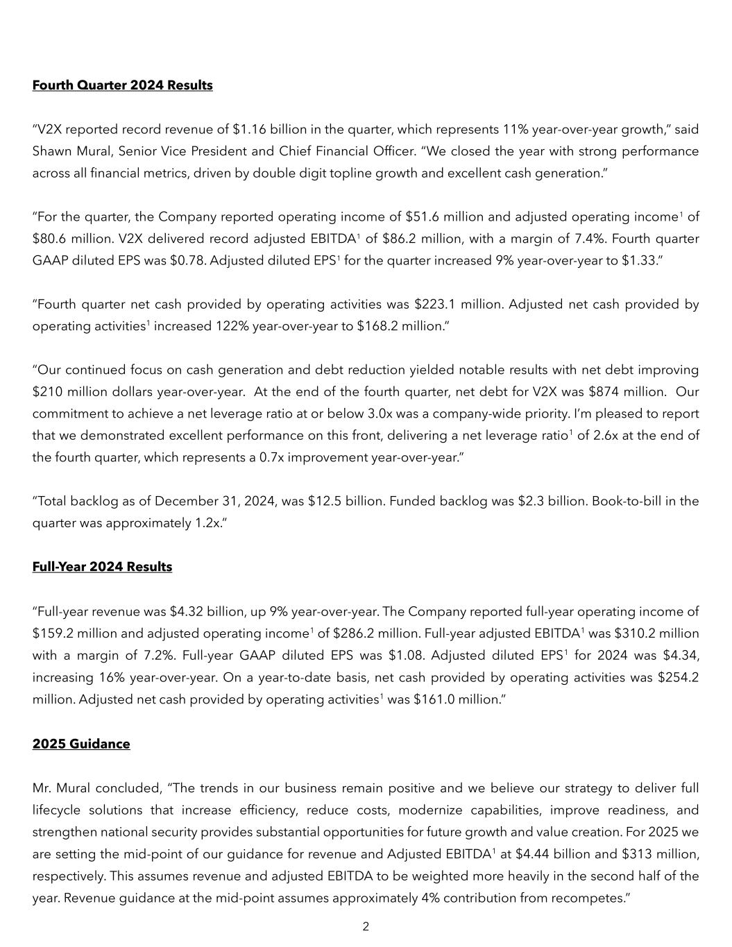 2 Fourth Quarter 2024 Results “V2X reported record revenue of $1.16 billion in the quarter, which represents 11% year-over-year growth,” said Shawn Mural, Senior Vice President and Chief Financial Officer. “We closed the year with strong performance across all financial metrics, driven by double digit topline growth and excellent cash generation.” “For the quarter, the Company reported operating income of $51.6 million and adjusted operating income1 of $80.6 million. V2X delivered record adjusted EBITDA1 of $86.2 million, with a margin of 7.4%. Fourth quarter GAAP diluted EPS was $0.78. Adjusted diluted EPS1 for the quarter increased 9% year-over-year to $1.33.” “Fourth quarter net cash provided by operating activities was $223.1 million. Adjusted net cash provided by operating activities1 increased 122% year-over-year to $168.2 million.” “Our continued focus on cash generation and debt reduction yielded notable results with net debt improving $210 million dollars year-over-year. At the end of the fourth quarter, net debt for V2X was $874 million. Our commitment to achieve a net leverage ratio at or below 3.0x was a company-wide priority. I’m pleased to report that we demonstrated excellent performance on this front, delivering a net leverage ratio1 of 2.6x at the end of the fourth quarter, which represents a 0.7x improvement year-over-year.” “Total backlog as of December 31, 2024, was $12.5 billion. Funded backlog was $2.3 billion. Book-to-bill in the quarter was approximately 1.2x.” Full-Year 2024 Results “Full-year revenue was $4.32 billion, up 9% year-over-year. The Company reported full-year operating income of $159.2 million and adjusted operating income1 of $286.2 million. Full-year adjusted EBITDA1 was $310.2 million with a margin of 7.2%. Full-year GAAP diluted EPS was $1.08. Adjusted diluted EPS1 for 2024 was $4.34, increasing 16% year-over-year. On a year-to-date basis, net cash provided by operating activities was $254.2 million. Adjusted net cash provided by operating activities1 was $161.0 million.” 2025 Guidance Mr. Mural concluded, “The trends in our business remain positive and we believe our strategy to deliver full lifecycle solutions that increase efficiency, reduce costs, modernize capabilities, improve readiness, and strengthen national security provides substantial opportunities for future growth and value creation. For 2025 we are setting the mid-point of our guidance for revenue and Adjusted EBITDA1 at $4.44 billion and $313 million, respectively. This assumes revenue and adjusted EBITDA to be weighted more heavily in the second half of the year. Revenue guidance at the mid-point assumes approximately 4% contribution from recompetes.”