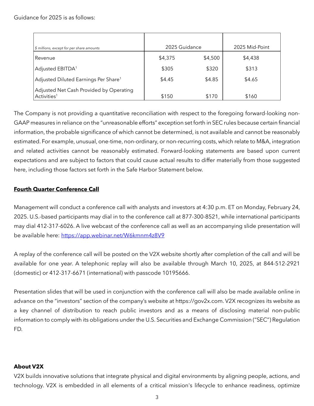 3 Guidance for 2025 is as follows: $ millions, except for per share amounts 2025 Guidance 2025 Mid-Point Revenue $4,375 $4,500 $4,438 Adjusted EBITDA1 $305 $320 $313 Adjusted Diluted Earnings Per Share1 $4.45 $4.85 $4.65 Adjusted Net Cash Provided by Operating Activities1 $150 $170 $160 The Company is not providing a quantitative reconciliation with respect to the foregoing forward-looking non- GAAP measures in reliance on the “unreasonable efforts” exception set forth in SEC rules because certain financial information, the probable significance of which cannot be determined, is not available and cannot be reasonably estimated. For example, unusual, one-time, non-ordinary, or non-recurring costs, which relate to M&A, integration and related activities cannot be reasonably estimated. Forward-looking statements are based upon current expectations and are subject to factors that could cause actual results to differ materially from those suggested here, including those factors set forth in the Safe Harbor Statement below. Fourth Quarter Conference Call Management will conduct a conference call with analysts and investors at 4:30 p.m. ET on Monday, February 24, 2025. U.S.-based participants may dial in to the conference call at 877-300-8521, while international participants may dial 412-317-6026. A live webcast of the conference call as well as an accompanying slide presentation will be available here: https://app.webinar.net/W6kmnm4z8V9 A replay of the conference call will be posted on the V2X website shortly after completion of the call and will be available for one year. A telephonic replay will also be available through March 10, 2025, at 844-512-2921 (domestic) or 412-317-6671 (international) with passcode 10195666. Presentation slides that will be used in conjunction with the conference call will also be made available online in advance on the “investors” section of the company’s website at https://gov2x.com. V2X recognizes its website as a key channel of distribution to reach public investors and as a means of disclosing material non-public information to comply with its obligations under the U.S. Securities and Exchange Commission (“SEC”) Regulation FD. About V2X V2X builds innovative solutions that integrate physical and digital environments by aligning people, actions, and technology. V2X is embedded in all elements of a critical mission's lifecycle to enhance readiness, optimize