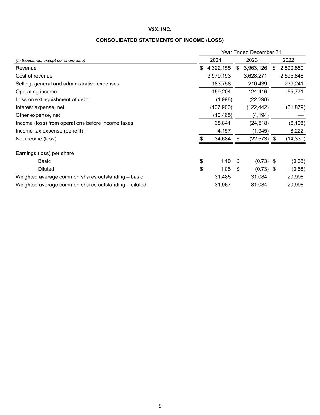 5 V2X, INC. CONSOLIDATED STATEMENTS OF INCOME (LOSS) Year Ended December 31, (In thousands, except per share data) 2024 2023 2022 Revenue $ 4,322,155 $ 3,963,126 $ 2,890,860 Cost of revenue 3,979,193 3,628,271 2,595,848 Selling, general and administrative expenses 183,758 210,439 239,241 Operating income 159,204 124,416 55,771 Loss on extinguishment of debt (1,998) (22,298) — Interest expense, net (107,900) (122,442) (61,879) Other expense, net (10,465) (4,194) — Income (loss) from operations before income taxes 38,841 (24,518) (6,108) Income tax expense (benefit) 4,157 (1,945) 8,222 Net income (loss) $ 34,684 $ (22,573) $ (14,330) Earnings (loss) per share Basic $ 1.10 $ (0.73) $ (0.68) Diluted $ 1.08 $ (0.73) $ (0.68) Weighted average common shares outstanding – basic 31,485 31,084 20,996 Weighted average common shares outstanding – diluted 31,967 31,084 20,996