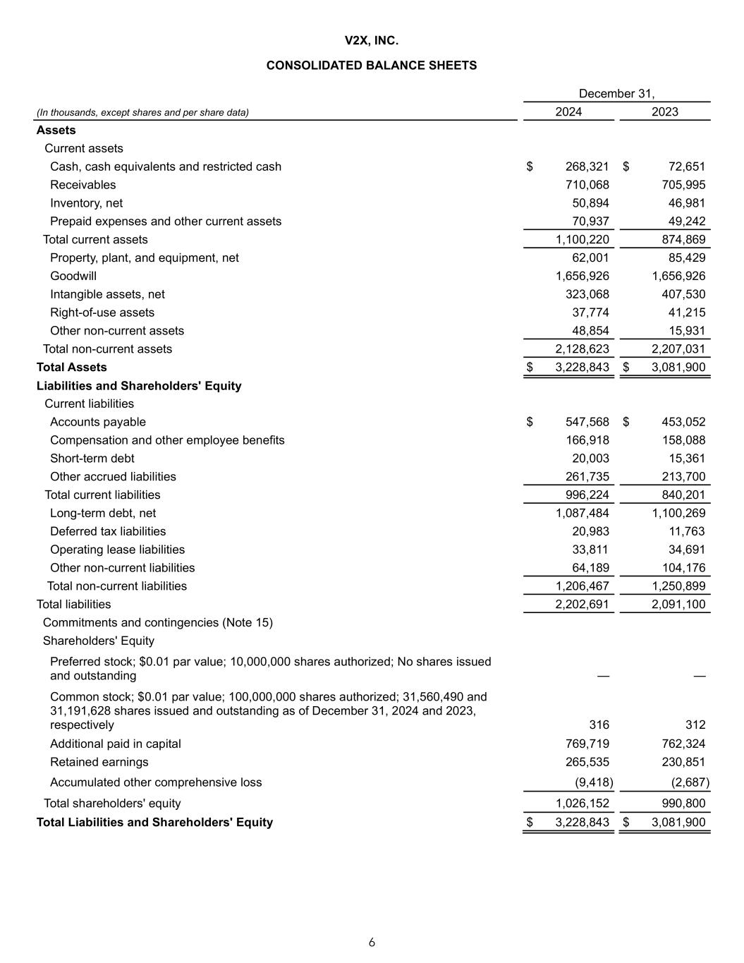 6 V2X, INC. CONSOLIDATED BALANCE SHEETS December 31, (In thousands, except shares and per share data) 2024 2023 Assets Current assets Cash, cash equivalents and restricted cash $ 268,321 $ 72,651 Receivables 710,068 705,995 Inventory, net 50,894 46,981 Prepaid expenses and other current assets 70,937 49,242 Total current assets 1,100,220 874,869 Property, plant, and equipment, net 62,001 85,429 Goodwill 1,656,926 1,656,926 Intangible assets, net 323,068 407,530 Right-of-use assets 37,774 41,215 Other non-current assets 48,854 15,931 Total non-current assets 2,128,623 2,207,031 Total Assets $ 3,228,843 $ 3,081,900 Liabilities and Shareholders' Equity Current liabilities Accounts payable $ 547,568 $ 453,052 Compensation and other employee benefits 166,918 158,088 Short-term debt 20,003 15,361 Other accrued liabilities 261,735 213,700 Total current liabilities 996,224 840,201 Long-term debt, net 1,087,484 1,100,269 Deferred tax liabilities 20,983 11,763 Operating lease liabilities 33,811 34,691 Other non-current liabilities 64,189 104,176 Total non-current liabilities 1,206,467 1,250,899 Total liabilities 2,202,691 2,091,100 Commitments and contingencies (Note 15) Shareholders' Equity Preferred stock; $0.01 par value; 10,000,000 shares authorized; No shares issued and outstanding — — Common stock; $0.01 par value; 100,000,000 shares authorized; 31,560,490 and 31,191,628 shares issued and outstanding as of December 31, 2024 and 2023, respectively 316 312 Additional paid in capital 769,719 762,324 Retained earnings 265,535 230,851 Accumulated other comprehensive loss (9,418) (2,687) Total shareholders' equity 1,026,152 990,800 Total Liabilities and Shareholders' Equity $ 3,228,843 $ 3,081,900