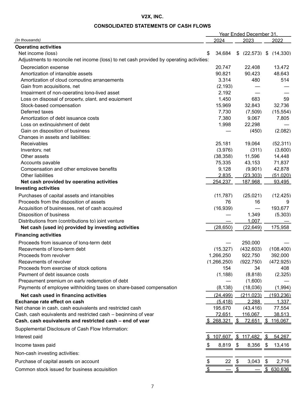 7 V2X, INC. CONSOLIDATED STATEMENTS OF CASH FLOWS Year Ended December 31, (In thousands) 2024 2023 2022 Operating activities Net income (loss) $ 34,684 $ (22,573) $ (14,330) Adjustments to reconcile net income (loss) to net cash provided by operating activities: Depreciation expense 20,747 22,408 13,472 Amortization of intangible assets 90,821 90,423 48,643 Amortization of cloud computing arrangements 3,314 480 514 Gain from acquisitions, net (2,193) — — Impairment of non-operating long-lived asset 2,192 — — Loss on disposal of property, plant, and equipment 1,450 683 59 Stock-based compensation 15,969 32,843 32,736 Deferred taxes 7,730 (7,509) (15,554) Amortization of debt issuance costs 7,380 9,067 7,805 Loss on extinguishment of debt 1,998 22,298 — Gain on disposition of business — (450) (2,082) Changes in assets and liabilities: Receivables 25,181 19,064 (52,311) Inventory, net (3,976) (311) (3,600) Other assets (38,358) 11,596 14,448 Accounts payable 75,335 43,153 71,837 Compensation and other employee benefits 9,128 (9,901) 42,878 Other liabilities 2,835 (23,303) (51,020) Net cash provided by operating activities 254,237 187,968 93,495 Investing activities Purchases of capital assets and intangibles (11,787) (25,021) (12,425) Proceeds from the disposition of assets 76 16 9 Acquisition of businesses, net of cash acquired (16,939) — 193,677 Disposition of business — 1,349 (5,303) Distributions from (contributions to) joint venture — 1,007 — Net cash (used in) provided by investing activities (28,650) (22,649) 175,958 Financing activities Proceeds from issuance of long-term debt — 250,000 — Repayments of long-term debt (15,327) (432,603) (108,400) Proceeds from revolver 1,266,250 922,750 392,000 Repayments of revolver (1,266,250) (922,750) (472,925) Proceeds from exercise of stock options 154 34 408 Payment of debt issuance costs (1,188) (8,818) (2,325) Prepayment premium on early redemption of debt — (1,600) — Payments of employee withholding taxes on share-based compensation (8,138) (18,036) (1,994) Net cash used in financing activities (24,499) (211,023) (193,236) Exchange rate effect on cash (5,418) 2,288 1,337 Net change in cash, cash equivalents and restricted cash 195,670 (43,416) 77,554 Cash, cash equivalents and restricted cash – beginning of year 72,651 116,067 38,513 Cash, cash equivalents and restricted cash – end of year $ 268,321 $ 72,651 $ 116,067 Supplemental Disclosure of Cash Flow Information: Interest paid $ 107,607 $ 117,482 $ 54,267 Income taxes paid $ 8,819 $ 8,356 $ 13,416 Non-cash investing activities: Purchase of capital assets on account $ 22 $ 3,043 $ 2,716 Common stock issued for business acquisition $ — $ — $ 630,636