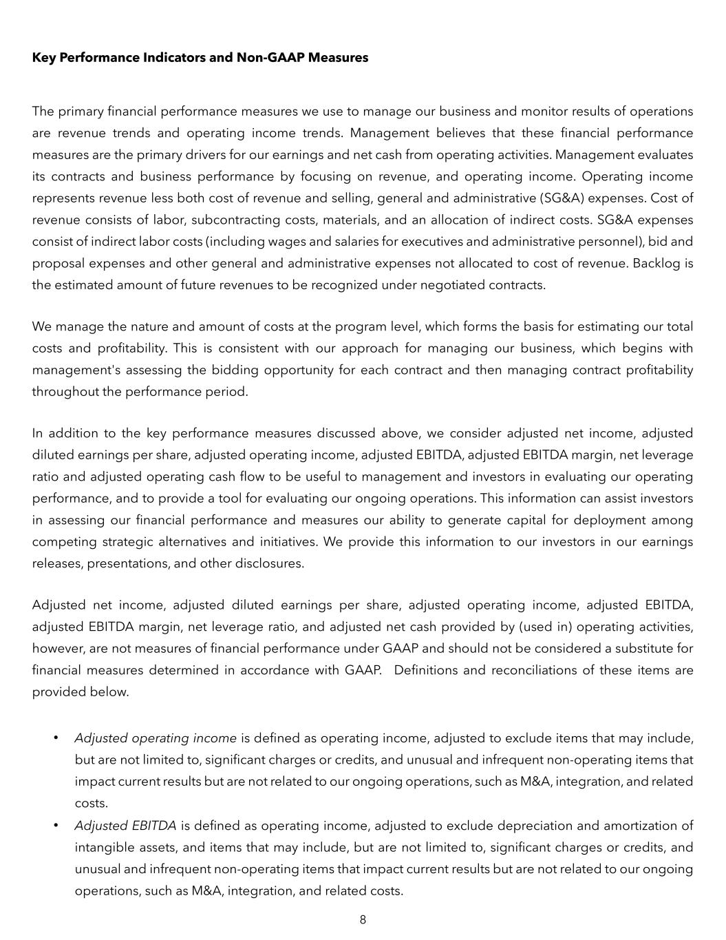 8 Key Performance Indicators and Non-GAAP Measures The primary financial performance measures we use to manage our business and monitor results of operations are revenue trends and operating income trends. Management believes that these financial performance measures are the primary drivers for our earnings and net cash from operating activities. Management evaluates its contracts and business performance by focusing on revenue, and operating income. Operating income represents revenue less both cost of revenue and selling, general and administrative (SG&A) expenses. Cost of revenue consists of labor, subcontracting costs, materials, and an allocation of indirect costs. SG&A expenses consist of indirect labor costs (including wages and salaries for executives and administrative personnel), bid and proposal expenses and other general and administrative expenses not allocated to cost of revenue. Backlog is the estimated amount of future revenues to be recognized under negotiated contracts. We manage the nature and amount of costs at the program level, which forms the basis for estimating our total costs and profitability. This is consistent with our approach for managing our business, which begins with management's assessing the bidding opportunity for each contract and then managing contract profitability throughout the performance period. In addition to the key performance measures discussed above, we consider adjusted net income, adjusted diluted earnings per share, adjusted operating income, adjusted EBITDA, adjusted EBITDA margin, net leverage ratio and adjusted operating cash flow to be useful to management and investors in evaluating our operating performance, and to provide a tool for evaluating our ongoing operations. This information can assist investors in assessing our financial performance and measures our ability to generate capital for deployment among competing strategic alternatives and initiatives. We provide this information to our investors in our earnings releases, presentations, and other disclosures. Adjusted net income, adjusted diluted earnings per share, adjusted operating income, adjusted EBITDA, adjusted EBITDA margin, net leverage ratio, and adjusted net cash provided by (used in) operating activities, however, are not measures of financial performance under GAAP and should not be considered a substitute for financial measures determined in accordance with GAAP. Definitions and reconciliations of these items are provided below. • Adjusted operating income is defined as operating income, adjusted to exclude items that may include, but are not limited to, significant charges or credits, and unusual and infrequent non-operating items that impact current results but are not related to our ongoing operations, such as M&A, integration, and related costs. • Adjusted EBITDA is defined as operating income, adjusted to exclude depreciation and amortization of intangible assets, and items that may include, but are not limited to, significant charges or credits, and unusual and infrequent non-operating items that impact current results but are not related to our ongoing operations, such as M&A, integration, and related costs.