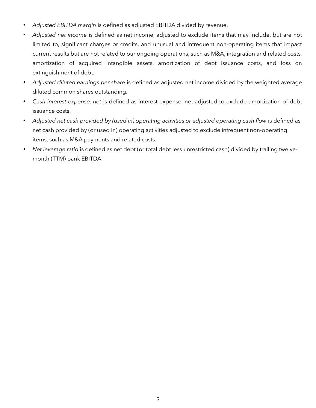 9 • Adjusted EBITDA margin is defined as adjusted EBITDA divided by revenue. • Adjusted net income is defined as net income, adjusted to exclude items that may include, but are not limited to, significant charges or credits, and unusual and infrequent non-operating items that impact current results but are not related to our ongoing operations, such as M&A, integration and related costs, amortization of acquired intangible assets, amortization of debt issuance costs, and loss on extinguishment of debt. • Adjusted diluted earnings per share is defined as adjusted net income divided by the weighted average diluted common shares outstanding. • Cash interest expense, net is defined as interest expense, net adjusted to exclude amortization of debt issuance costs. • Adjusted net cash provided by (used in) operating activities or adjusted operating cash flow is defined as net cash provided by (or used in) operating activities adjusted to exclude infrequent non-operating items, such as M&A payments and related costs. • Net leverage ratio is defined as net debt (or total debt less unrestricted cash) divided by trailing twelve- month (TTM) bank EBITDA.