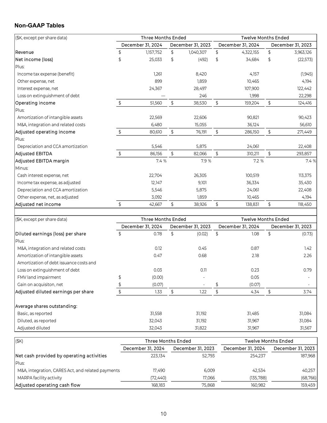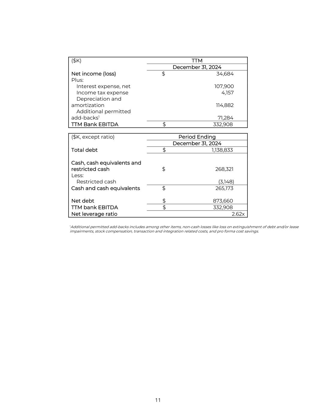 10 Non-GAAP Tables ($K, except per share data) December 31, 2024 December 31, 2023 December 31, 2024 December 31, 2023 Revenue 1,157,752$ 1,040,307$ 4,322,155$ 3,963,126$ Net income (loss) 25,033$ (492)$ 34,684$ (22,573)$ Plus: Income tax expense (benefit) 1,261 8,420 4,157 (1,945) Other expense, net 899 1,859 10,465 4,194 Interest expense, net 24,367 28,497 107,900 122,442 Loss on extinguishment of debt — 246 1,998 22,298 Operating income 51,560$ 38,530$ 159,204$ 124,416$ Plus: Amortization of intangible assets 22,569 22,606 90,821 90,423 M&A, integration and related costs 6,480 15,055 36,124 56,610 Adjusted operating income 80,610$ 76,191$ 286,150$ 271,449$ Plus: Depreciation and CCA amortization 5,546 5,875 24,061 22,408 Adjusted EBITDA 86,156$ 82,066$ 310,211$ 293,857$ Adjusted EBITDA margin 7.4 % 7.9 % 7.2 % 7.4 % Minus: Cash interest expense, net 22,704 26,305 100,519 113,375 Income tax expense, as adjusted 12,147 9,101 36,334 35,430 Depreciation and CCA amortization 5,546 5,875 24,061 22,408 Other expense, net, as adjusted 3,092 1,859 10,465 4,194 Adjusted net income 42,667$ 38,926$ 138,831$ 118,450$ ($K, except per share data) December 31, 2024 December 31, 2023 December 31, 2024 December 31, 2023 Diluted earnings (loss) per share 0.78$ (0.02)$ 1.08$ (0.73)$ Plus: M&A, integration and related costs 0.12 0.45 0.87 1.42 Amortization of intangible assets 0.47 0.68 2.18 2.26 Amortization of debt issuance costs and Loss on extinguishment of debt 0.03 0.11 0.23 0.79 FMV land impairment (0.00)$ - 0.05 - Gain on acquisiton, net (0.07)$ - (0.07)$ - Adjusted diluted earnings per share 1.33$ 1.22$ 4.34$ 3.74$ Average shares outstanding: Basic, as reported 31,558 31,192 31,485 31,084 Diluted, as reported 32,043 31,192 31,967 31,084 Adjusted diluted 32,043 31,822 31,967 31,567 Three Months Ended Twelve Months Ended Three Months Ended Twelve Months Ended ($K) December 31, 2024 December 31, 2023 December 31, 2024 December 31, 2023 Net cash provided by operating activities 223,134 52,793 254,237 187,968 Plus: M&A, integration, CARES Act, and related payments 17,490 6,009 42,534 40,257 MARPA facility activity (72,440) 17,066 (135,788) (68,766) Adjusted operating cash flow 168,183 75,868 160,982 159,459 Three Months Ended Twelve Months Ended