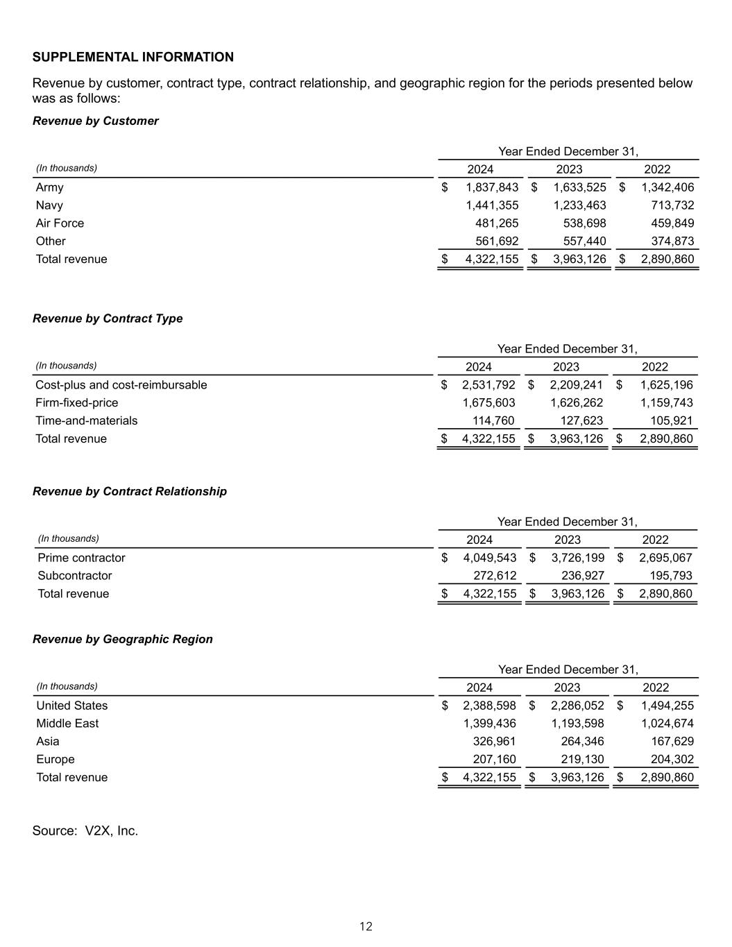 12 SUPPLEMENTAL INFORMATION Revenue by customer, contract type, contract relationship, and geographic region for the periods presented below was as follows: Revenue by Customer Year Ended December 31, (In thousands) 2024 2023 2022 Army $ 1,837,843 $ 1,633,525 $ 1,342,406 Navy 1,441,355 1,233,463 713,732 Air Force 481,265 538,698 459,849 Other 561,692 557,440 374,873 Total revenue $ 4,322,155 $ 3,963,126 $ 2,890,860 Revenue by Contract Type Year Ended December 31, (In thousands) 2024 2023 2022 Cost-plus and cost-reimbursable $ 2,531,792 $ 2,209,241 $ 1,625,196 Firm-fixed-price 1,675,603 1,626,262 1,159,743 Time-and-materials 114,760 127,623 105,921 Total revenue $ 4,322,155 $ 3,963,126 $ 2,890,860 Revenue by Contract Relationship Year Ended December 31, (In thousands) 2024 2023 2022 Prime contractor $ 4,049,543 $ 3,726,199 $ 2,695,067 Subcontractor 272,612 236,927 195,793 Total revenue $ 4,322,155 $ 3,963,126 $ 2,890,860 Revenue by Geographic Region Year Ended December 31, (In thousands) 2024 2023 2022 United States $ 2,388,598 $ 2,286,052 $ 1,494,255 Middle East 1,399,436 1,193,598 1,024,674 Asia 326,961 264,346 167,629 Europe 207,160 219,130 204,302 Total revenue $ 4,322,155 $ 3,963,126 $ 2,890,860 Source: V2X, Inc.