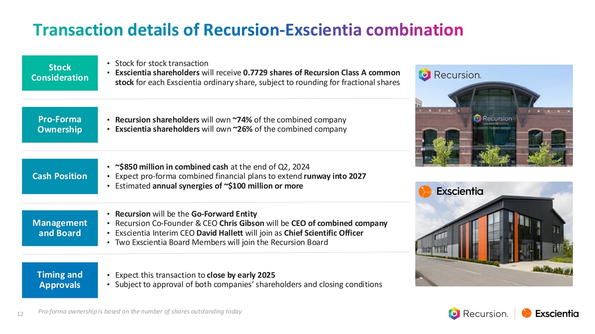 Recursion + Exscientia: Summary of complementary factors Scaled exploration and mapping of Precision chemistry design and Platform Strength biological relationships molecular synthesis First-in-class products in oncology, Best-in-class products in oncology, Internal Pipeline rare disease, infectious disease inflammation, immunology Roche-Genentech (neuro, single Sanofi (oncology, immunology), Large Pharma Partnerships GI-onc indication), Bayer (oncology) Merck KGaA (onc, immunology) Cash (End of Q2 2024) ~$475 million ~$370 million* Salt Lake City, London, Toronto, Oxford, Boston, Vienna, Locations Montreal, San Francisco Bay Area Dundee, Miami Employees >500 >350 This preliminary financial data for Exscientia has been prepared by and is the responsibility of Exscientia, and it has not been reviewed 11 or audited by the company’s independent auditor. Exscientia’s actual results may differ from these preliminary financial results.