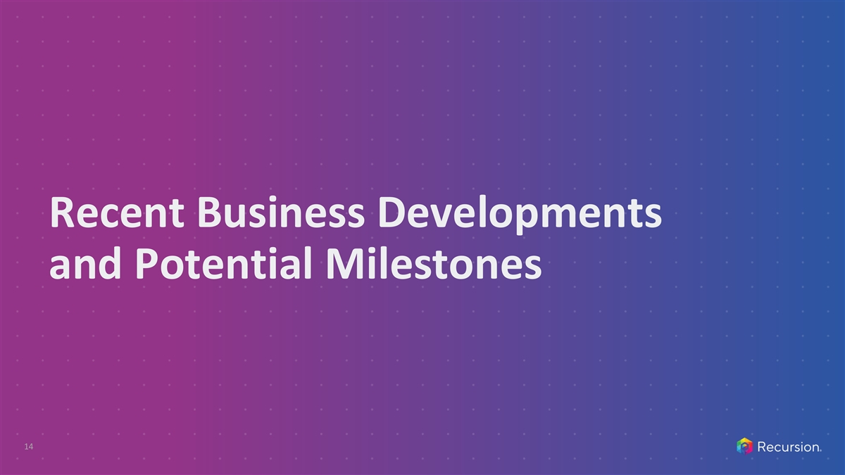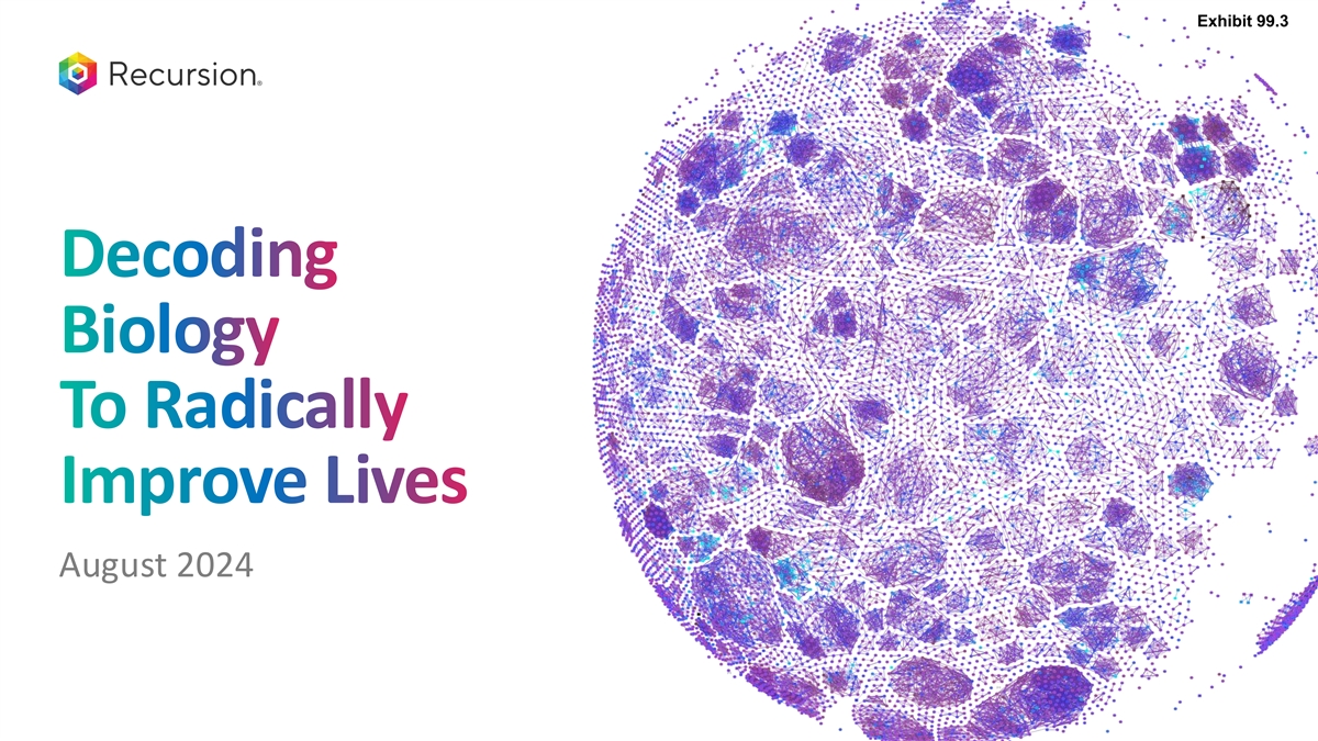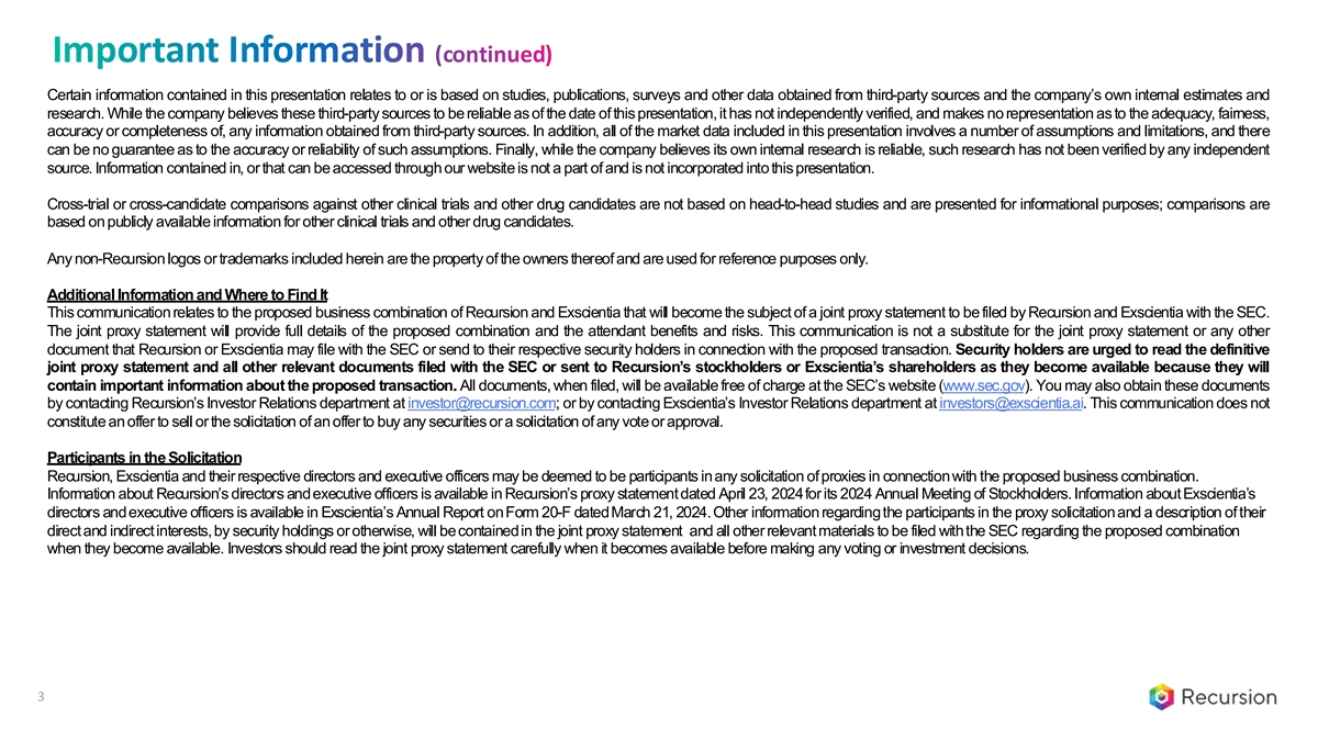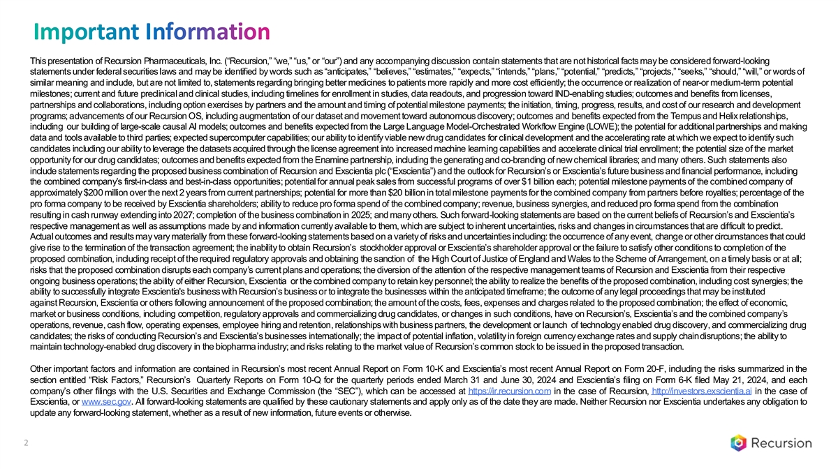 Important Information This presentation of Recursion Pharmaceuticals, Inc. (“Recursion,” “we,” “us,” or “our”) and any accompanying discussion contain statements that are not historical facts may be considered forward-looking statements under federal securities laws and may be identified by words such as “anticipates,” “believes,” “estimates,” “expects,” “intends,” “plans,” “potential,” “predicts,” “projects,” “seeks,” “should,” “will,” or words of similar meaning and include, but are not limited to, statements regarding bringing better medicines to patients more rapidly and more cost efficiently; the occurrence or realization of near-or medium-term potential milestones; current and future preclinical and clinical studies, including timelines for enrollment in studies, data readouts, and progression toward IND-enabling studies; outcomes and benefits from licenses, partnerships and collaborations, including option exercises by partners and the amount and timing of potential milestone payments; the initiation, timing, progress, results, and cost of our research and development programs; advancements of our Recursion OS, including augmentation of our dataset and movement toward autonomous discovery; outcomes and benefits expected from the Tempus and Helix relationships, including our building of large-scale causal AI models; outcomes and benefits expected from the Large Language Model-Orchestrated Workflow Engine (LOWE); the potential for additional partnerships and making data and tools available to third parties; expected supercomputer capabilities; our ability to identify viable new drug candidates for clinical development and the accelerating rate at which we expect to identify such candidates including our ability to leverage the datasets acquired through the license agreement into increased machine learning capabilities and accelerate clinical trial enrollment; the potential size of the market opportunity for our drug candidates; outcomes and benefits expected from the Enamine partnership, including the generating and co-branding of new chemical libraries; and many others. Such statements also include statements regarding the proposed business combination of Recursion and Exscientia plc (“Exscientia”) and the outlook for Recursion’s or Exscientia’s future business and financial performance, including the combined company’s first-in-class and best-in-class opportunities; potential for annual peak sales from successful programs of over $1 billion each; potential milestone payments of the combined company of approximately $200 million over the next 2 years from current partnerships; potential for more than $20 billion in total milestone payments for the combined company from partners before royalties; percentage of the pro forma company to be received by Exscientia shareholders; ability to reduce pro forma spend of the combined company; revenue, business synergies, and reduced pro forma spend from the combination resulting in cash runway extending into 2027; completion of the business combination in 2025; and many others. Such forward-looking statements are based on the current beliefs of Recursion’s and Exscientia’s respective management as well as assumptions made by and information currently available to them, which are subject to inherent uncertainties, risks and changes in circumstances that are difficult to predict. Actual outcomes and results may vary materially from these forward-looking statements based on a variety of risks and uncertainties including: the occurrence of any event, change or other circumstances that could give rise to the termination of the transaction agreement; the inability to obtain Recursion’s stockholder approval or Exscientia’s shareholder approval or the failure to satisfy other conditions to completion of the proposed combination, including receipt of the required regulatory approvals and obtaining the sanction of the High Court of Justice of England and Wales to the Scheme of Arrangement, on a timely basis or at all; risks that the proposed combination disrupts each company’s current plans and operations; the diversion of the attention of the respective management teams of Recursion and Exscientia from their respective ongoing business operations; the ability of either Recursion, Exscientia or the combined company to retain key personnel; the ability to realize the benefits of the proposed combination, including cost synergies; the ability to successfully integrate Exscientia's business with Recursion’s business or to integrate the businesses within the anticipated timeframe; the outcome of any legal proceedings that may be instituted againstRecursion, Exscientia or others following announcement of the proposed combination; the amount of the costs, fees, expenses and charges related to the proposed combination; the effect of economic, market or business conditions, including competition, regulatory approvals and commercializing drug candidates, or changes in such conditions, have on Recursion’s, Exscientia’s and the combined company’s operations, revenue, cash flow, operating expenses, employee hiring and retention, relationships with business partners, the development or launch of technology enabled drug discovery, and commercializing drug candidates; the risks of conducting Recursion’s and Exscientia’s businesses internationally; the impact of potential inflation, volatility in foreign currency exchange rates and supply chain disruptions; the ability to maintain technology-enabled drug discovery in the biopharma industry; and risks relating to the market value of Recursion’s common stock to be issued in the proposed transaction. Other important factors and information are contained in Recursion’s most recent Annual Report on Form 10-K and Exscientia’s most recent Annual Report on Form 20-F, including the risks summarized in the section entitled “Ri