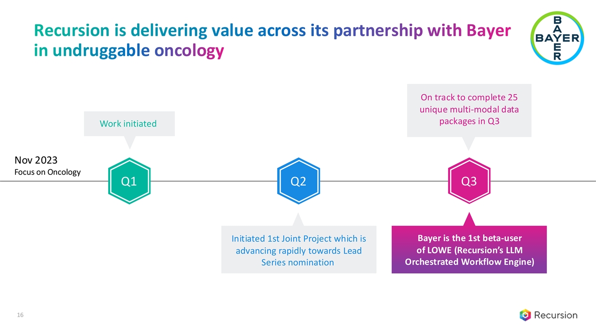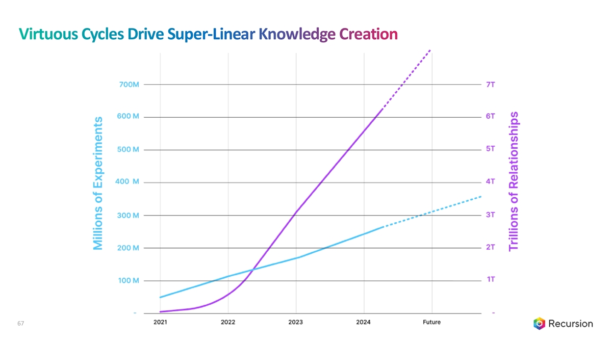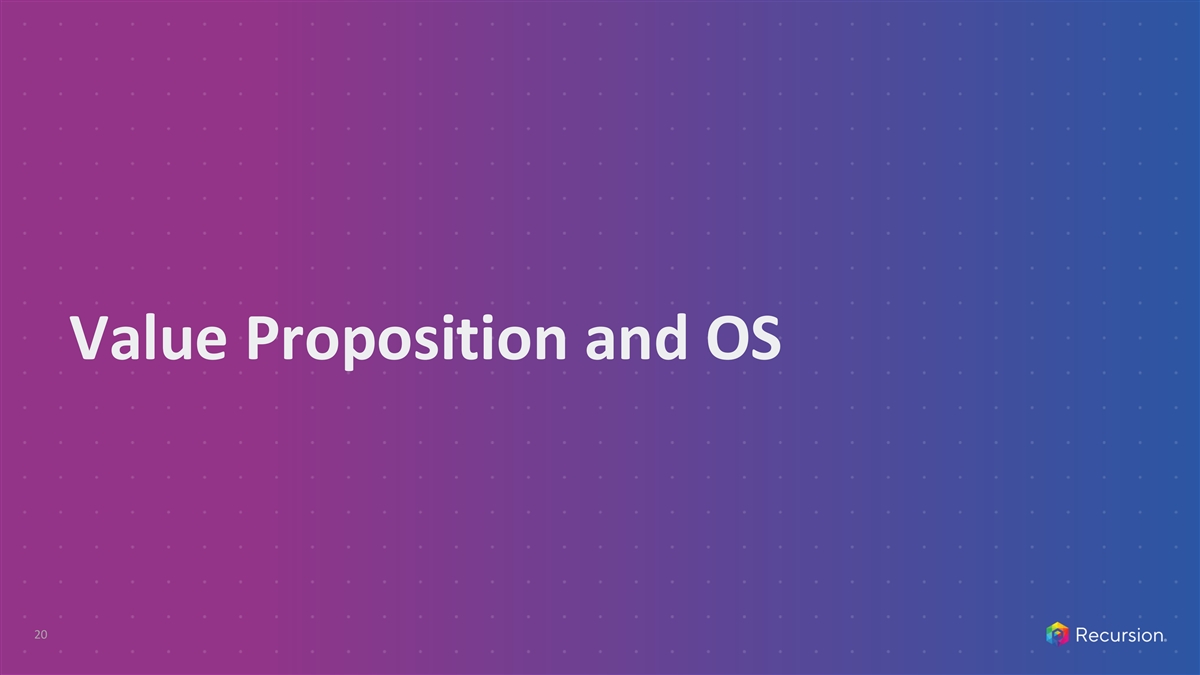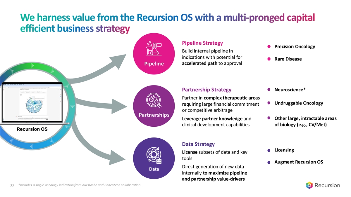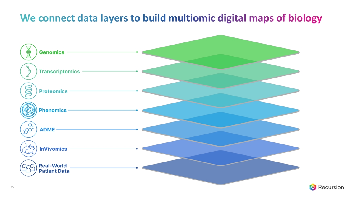 Important Information This presentation of Recursion Pharmaceuticals, Inc. (“Recursion,” “we,” “us,” or “our”) and any accompanying discussion contain statements that are not historical facts may be considered forward-looking statements under federal securities laws and may be identified by words such as “anticipates,” “believes,” “estimates,” “expects,” “intends,” “plans,” “potential,” “predicts,” “projects,” “seeks,” “should,” “will,” or words of similar meaning and include, but are not limited to, statements regarding bringing better medicines to patients more rapidly and more cost efficiently; the occurrence or realization of near-or medium-term potential milestones; current and future preclinical and clinical studies, including timelines for enrollment in studies, data readouts, and progression toward IND-enabling studies; outcomes and benefits from licenses, partnerships and collaborations, including option exercises by partners and the amount and timing of potential milestone payments; the initiation, timing, progress, results, and cost of our research and development programs; advancements of our Recursion OS, including augmentation of our dataset and movement toward autonomous discovery; outcomes and benefits expected from the Tempus and Helix relationships, including our building of large-scale causal AI models; outcomes and benefits expected from the Large Language Model-Orchestrated Workflow Engine (LOWE); the potential for additional partnerships and making data and tools available to third parties; expected supercomputer capabilities; our ability to identify viable new drug candidates for clinical development and the accelerating rate at which we expect to identify such candidates including our ability to leverage the datasets acquired through the license agreement into increased machine learning capabilities and accelerate clinical trial enrollment; the potential size of the market opportunity for our drug candidates; outcomes and benefits expected from the Enamine partnership, including the generating and co-branding of new chemical libraries; and many others. Such statements also include statements regarding the proposed business combination of Recursion and Exscientia plc (“Exscientia”) and the outlook for Recursion’s or Exscientia’s future business and financial performance, including the combined company’s first-in-class and best-in-class opportunities; potential for annual peak sales from successful programs of over $1 billion each; potential milestone payments of the combined company of approximately $200 million over the next 2 years from current partnerships; potential for more than $20 billion in total milestone payments for the combined company from partners before royalties; percentage of the pro forma company to be received by Exscientia shareholders; ability to reduce pro forma spend of the combined company; revenue, business synergies, and reduced pro forma spend from the combination resulting in cash runway extending into 2027; completion of the business combination in 2025; and many others. Such forward-looking statements are based on the current beliefs of Recursion’s and Exscientia’s respective management as well as assumptions made by and information currently available to them, which are subject to inherent uncertainties, risks and changes in circumstances that are difficult to predict. Actual outcomes and results may vary materially from these forward-looking statements based on a variety of risks and uncertainties including: the occurrence of any event, change or other circumstances that could give rise to the termination of the transaction agreement; the inability to obtain Recursion’s stockholder approval or Exscientia’s shareholder approval or the failure to satisfy other conditions to completion of the proposed combination, including receipt of the required regulatory approvals and obtaining the sanction of the High Court of Justice of England and Wales to the Scheme of Arrangement, on a timely basis or at all; risks that the proposed combination disrupts each company’s current plans and operations; the diversion of the attention of the respective management teams of Recursion and Exscientia from their respective ongoing business operations; the ability of either Recursion, Exscientia or the combined company to retain key personnel; the ability to realize the benefits of the proposed combination, including cost synergies; the ability to successfully integrate Exscientia's business with Recursion’s business or to integrate the businesses within the anticipated timeframe; the outcome of any legal proceedings that may be instituted againstRecursion, Exscientia or others following announcement of the proposed combination; the amount of the costs, fees, expenses and charges related to the proposed combination; the effect of economic, market or business conditions, including competition, regulatory approvals and commercializing drug candidates, or changes in such conditions, have on Recursion’s, Exscientia’s and the combined company’s operations, revenue, cash flow, operating expenses, employee hiring and retention, relationships with business partners, the development or launch of technology enabled drug discovery, and commercializing drug candidates; the risks of conducting Recursion’s and Exscientia’s businesses internationally; the impact of potential inflation, volatility in foreign currency exchange rates and supply chain disruptions; the ability to maintain technology-enabled drug discovery in the biopharma industry; and risks relating to the market value of Recursion’s common stock to be issued in the proposed transaction. Other important factors and information are contained in Recursion’s most recent Annual Report on Form 10-K and Exscientia’s most recent Annual Report on Form 20-F, including the risks summarized in the section entitled “Ri