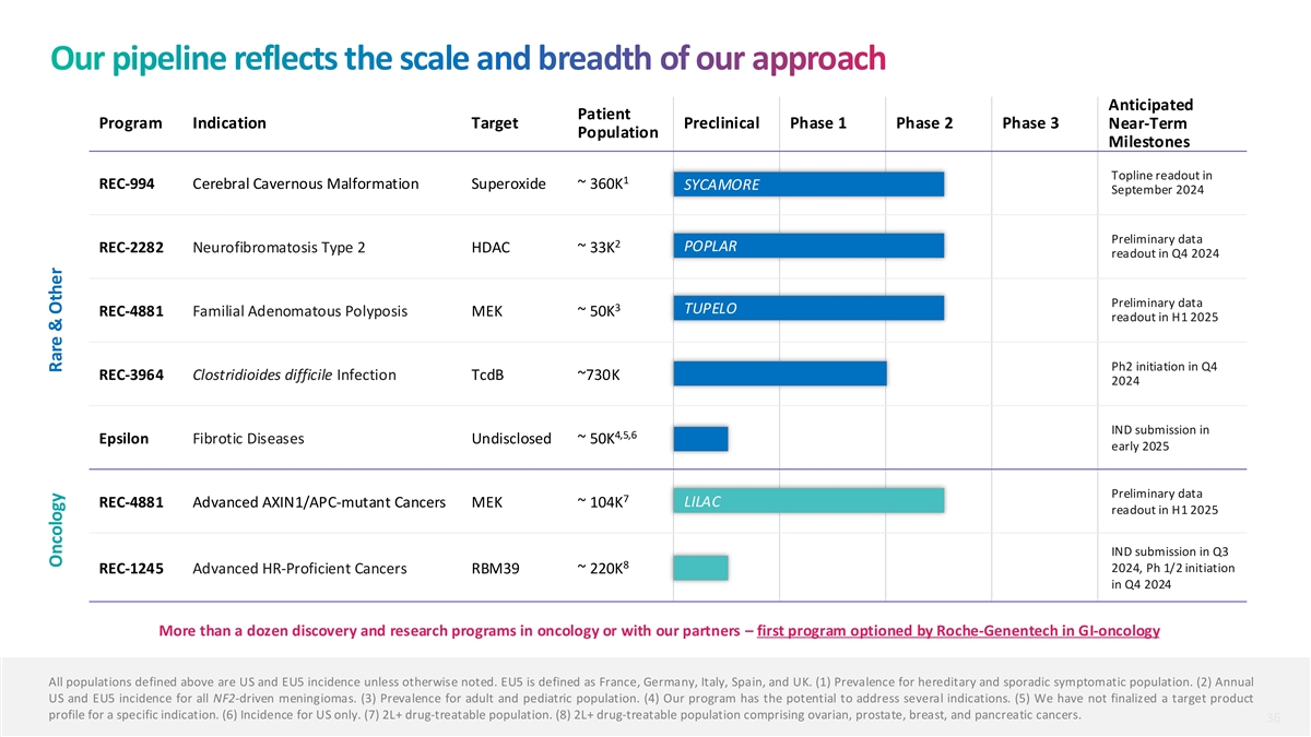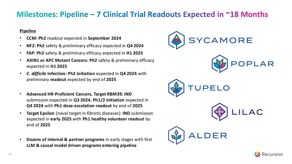Milestones: Pipeline – 7 Clinical Trial Readouts Expected in ~18 Months Pipeline • CCM: Ph2 readout expected in September 2024 • NF2: Ph2 safety & preliminary efficacy expected in Q4 2024 • FAP: Ph2 safety & preliminary efficacy expected in H1 2025 • AXIN1 or APC Mutant Cancers: Ph2 safety & preliminary efficacy expected in H1 2025 • C. difficile Infection: Ph2 initiation expected in Q4 2024 with preliminary readout expected by end of 2025 • Advanced HR-Proficient Cancers, Target RBM39: IND submission expected in Q3 2024. Ph1/2 initiation expected in Q4 2024 with Ph1 dose-escalation readout by end of 2025 • Target Epsilon (novel target in fibrotic diseases): IND submission expected in early 2025 with Ph1 healthy volunteer readout by end of 2025 • Dozens of internal & partner programs in early stages with first LLM & causal model driven programs entering pipeline 18