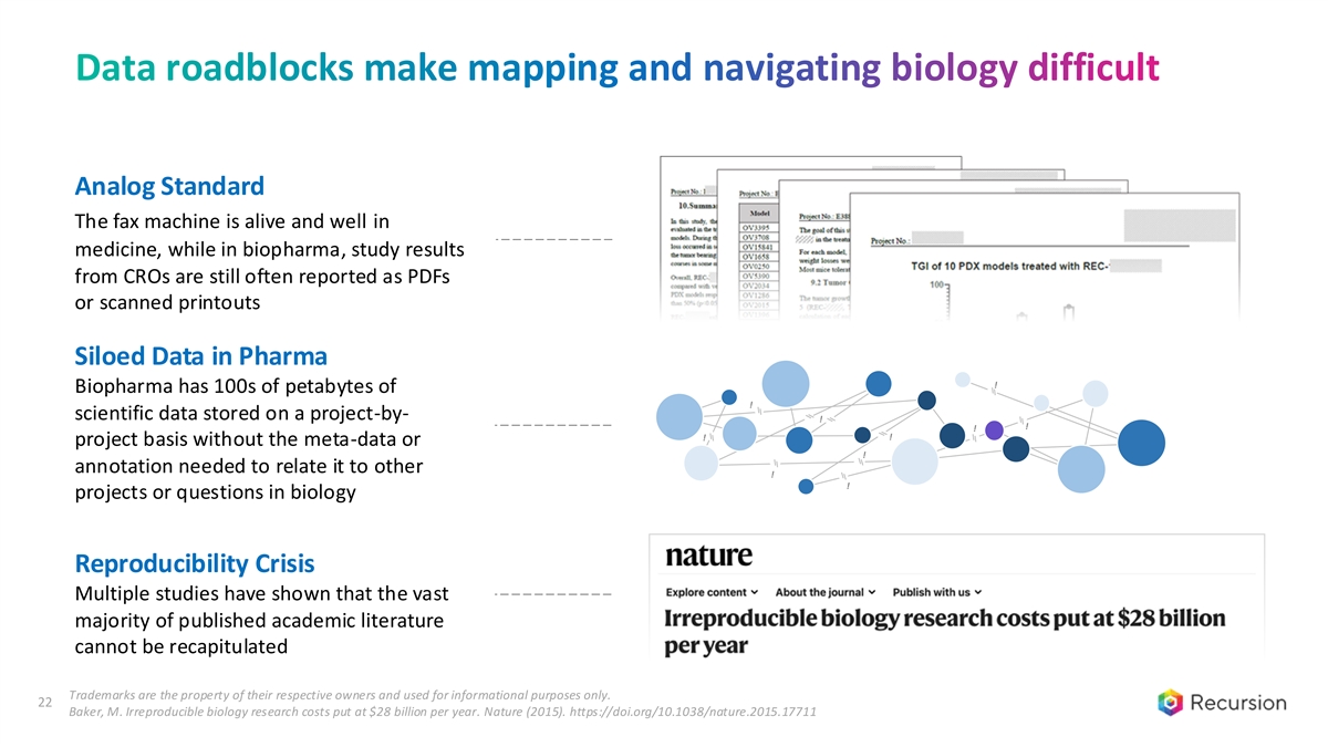 Data roadblocks make mapping and navigating biology difficult Analog Standard The fax machine is alive and well in medicine, while in biopharma, study results from CROs are still often reported as PDFs or scanned printouts Siloed Data in Pharma ! Biopharma has 100s of petabytes of ! scientific data stored on a project-by- ! ! ! ! ! project basis without the meta-data or ! annotation needed to relate it to other ! ! projects or questions in biology Reproducibility Crisis Multiple studies have shown that the vast majority of published academic literature cannot be recapitulated Trademarks are the property of their respective owners and used for informational purposes only. 22 Baker, M. Irreproducible biology research costs put at $28 billion per year. Nature (2015). https://doi.org/10.1038/nature.2015.17711