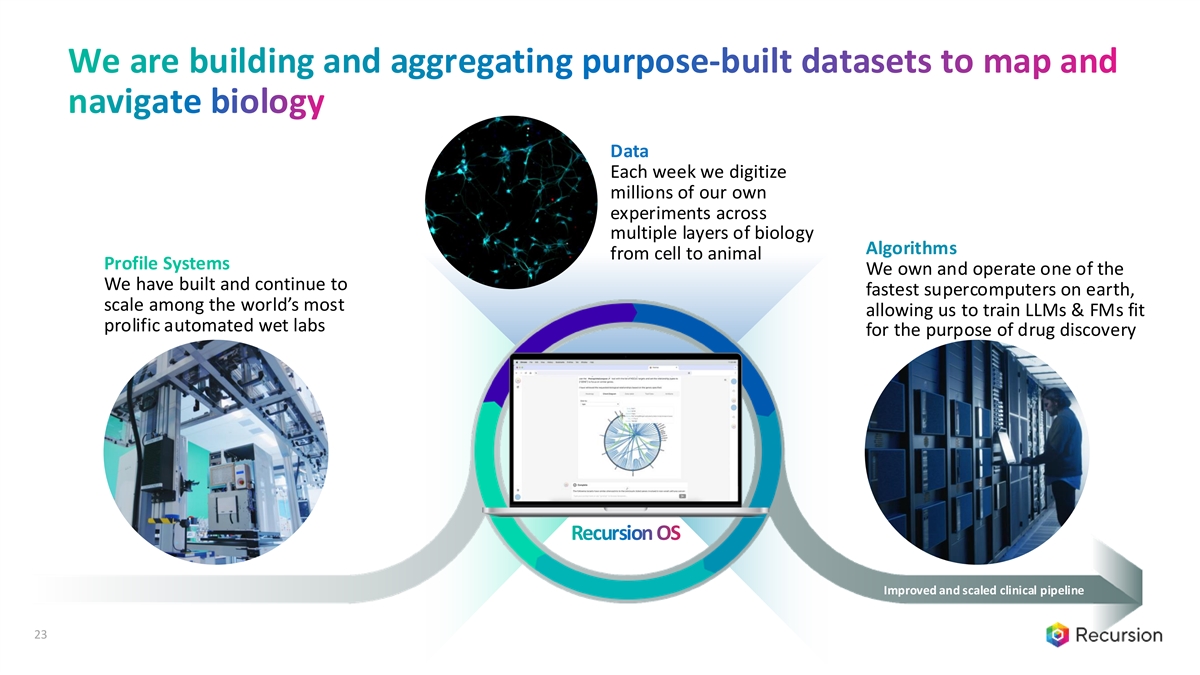We are building and aggregating purpose-built datasets to map and navigate biology Data Each week we digitize millions of our own experiments across multiple layers of biology Algorithms from cell to animal Profile Systems We own and operate one of the We have built and continue to fastest supercomputers on earth, scale among the world’s most allowing us to train LLMs & FMs fit prolific automated wet labs for the purpose of drug discovery Recursion OS Improved and scaled clinical pipeline 23