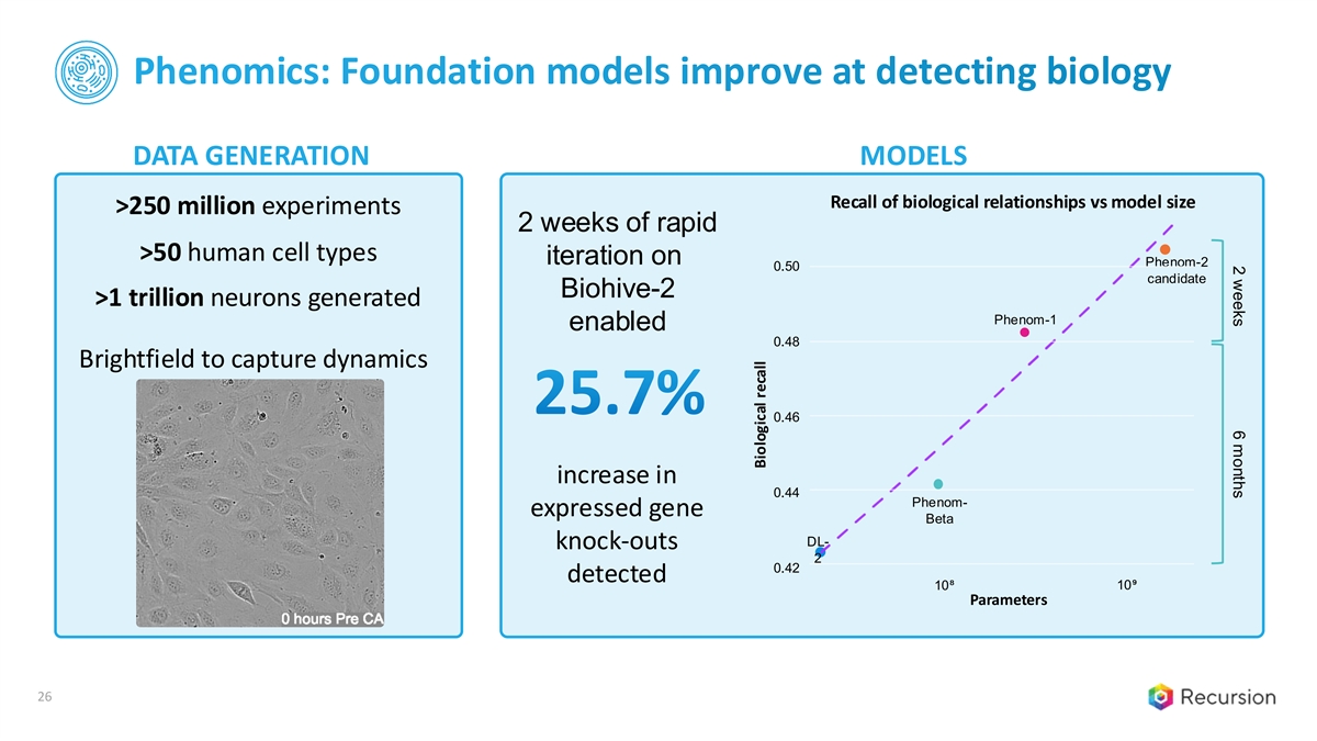 2 weeks 6 months Phenomics: Foundation models improve at detecting biology DATA GENERATION MODELS Recall of biological relationships vs model size >250 million experiments 2 weeks of rapid >50 human cell types iteration on Phenom-2 0.50 candidate Biohive-2 >1 trillion neurons generated Phenom-1 enabled 0.48 Brightfield to capture dynamics 25.7% 0.46 increase in 0.44 Phenom- expressed gene Beta DL- knock-outs 2 0.42 detected 10⁸ 10⁹ Parameters 26 Biological recall