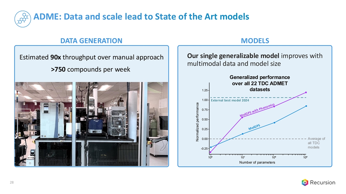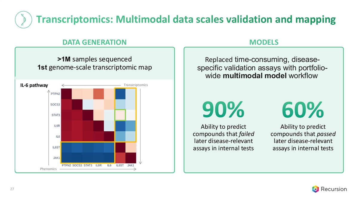 Transcriptomics: Multimodal data scales validation and mapping DATA GENERATION MODELS >1M samples sequenced Replaced time-consuming, disease- 1st genome-scale transcriptomic map specific validation assays with portfolio- wide multimodal model workflow Transcriptomics IL-6 pathway 90% 60% Ability to predict Ability to predict compounds that failed compounds that passed later disease-relevant later disease-relevant assays in internal tests assays in internal tests Phenomics 27