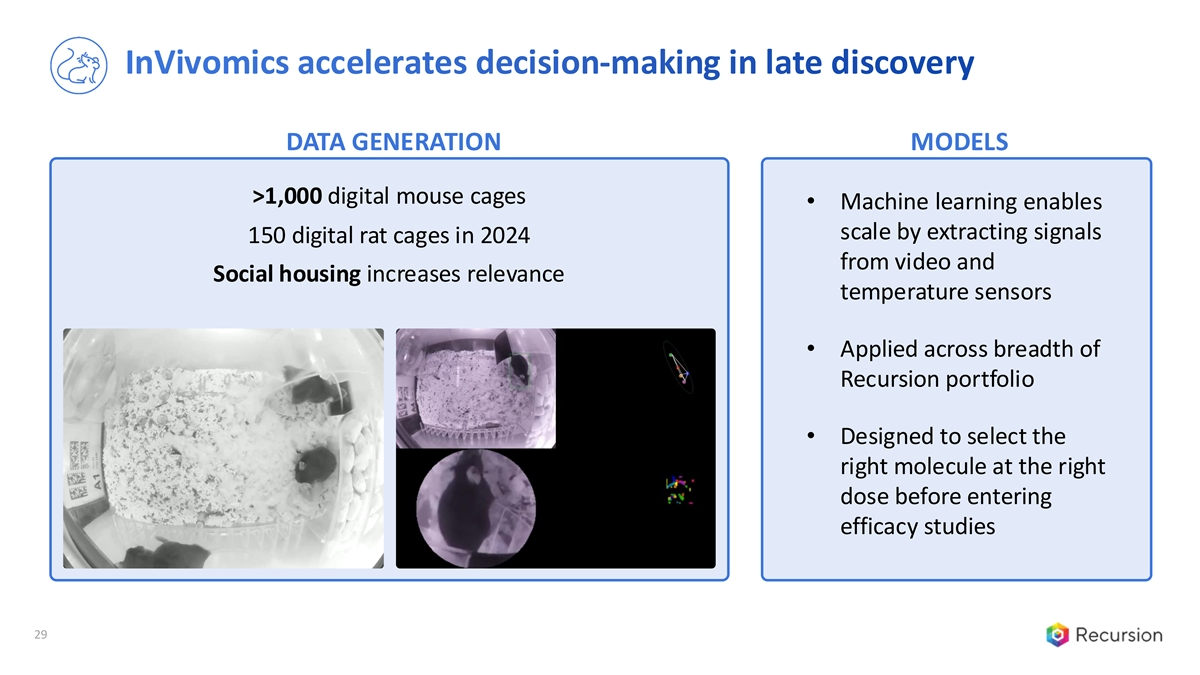 InVivomics accelerates decision-making in late discovery DATA GENERATION MODELS >1,000 digital mouse cages • Machine learning enables scale by extracting signals 150 digital rat cages in 2024 from video and Social housing increases relevance temperature sensors • Applied across breadth of Recursion portfolio • Designed to select the right molecule at the right dose before entering efficacy studies 29