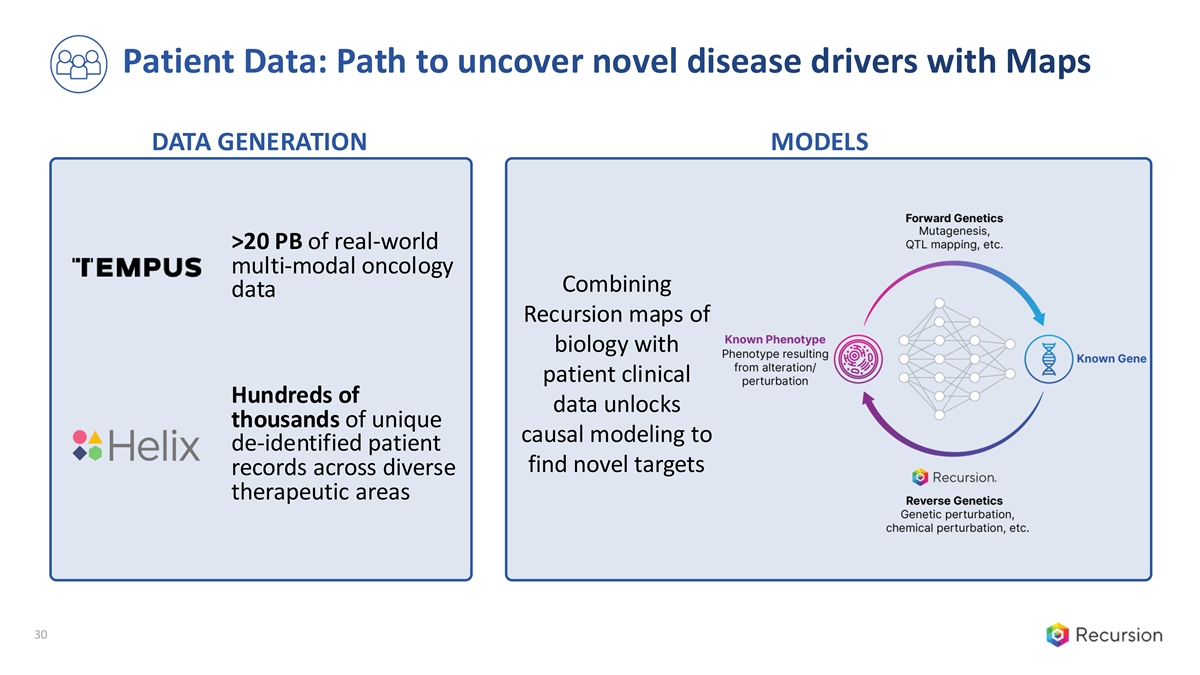 Patient Data: Path to uncover novel disease drivers with Maps DATA GENERATION MODELS >20 PB of real-world multi-modal oncology Combining data Recursion maps of biology with patient clinical Hundreds of data unlocks thousands of unique causal modeling to de-identified patient find novel targets records across diverse therapeutic areas 30