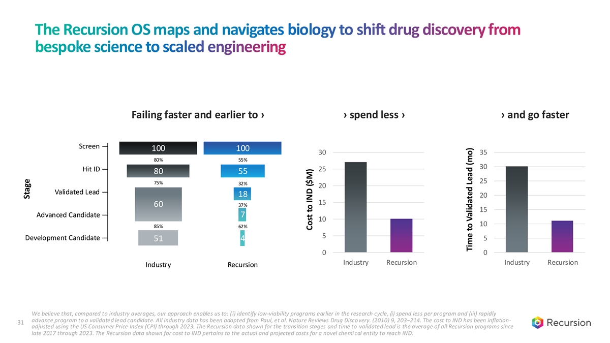 The Recursion OS maps and navigates biology to shift drug discovery from bespoke science to scaled engineering Failing faster and earlier to › › spend less › › and go faster Recursion Industry Screen — 100 100 30 35 80% 55% 30 Hit ID — 25 80 55 25 75% 32% 20 Validated Lead — 18 20 15 60 37% 15 Advanced Candidate — 7 10 10 85% 62% 5 Development Candidate — 5 51 4 0 0 Industry Recursion Industry Recursion Industry Recursion We believe that, compared to industry averages, our approach enables us to: (i) identify low-viability programs earlier in the research cycle, (i) spend less per program and (iii) rapidly advance program to a validated lead candidate. All industry data has been adapted from Paul, et al. Nature Reviews Drug Discovery. (2010) 9, 203–214. The cost to IND has been inflation- 31 adjusted using the US Consumer Price Index (CPI) through 2023. The Recursion data shown for the transition stages and time to validated lead is the average of all Recursion programs since late 2017 through 2023. The Recursion data shown for cost to IND pertains to the actual and projected costs for a novel chemi cal entity to reach IND. Stage Cost to IND ($M) Time to Validated Lead (mo)