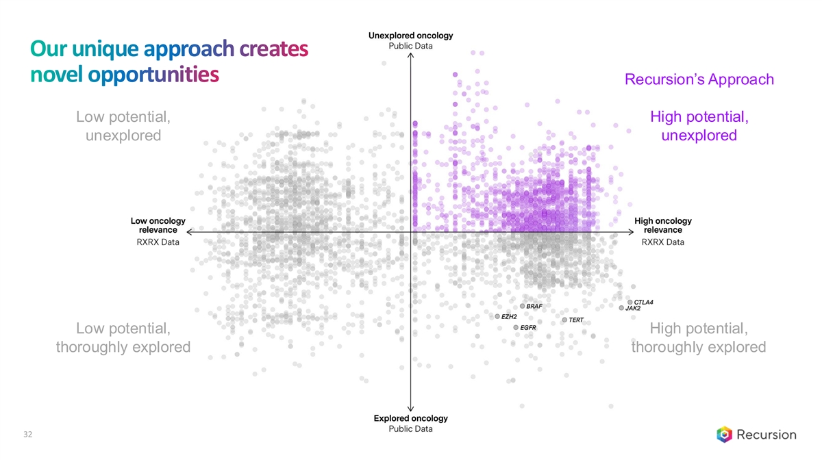 Our unique approach creates novel opportunities Recursion’s Approach High potential, Low potential, unexplored unexplored Low potential, High potential, thoroughly explored thoroughly explored 32
