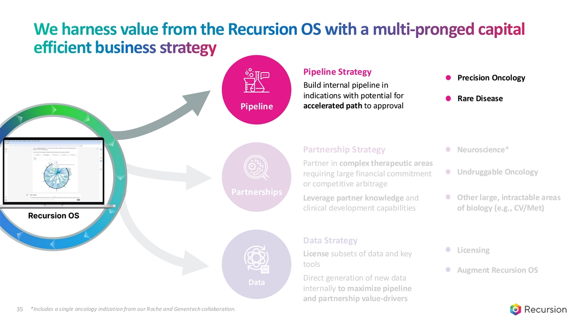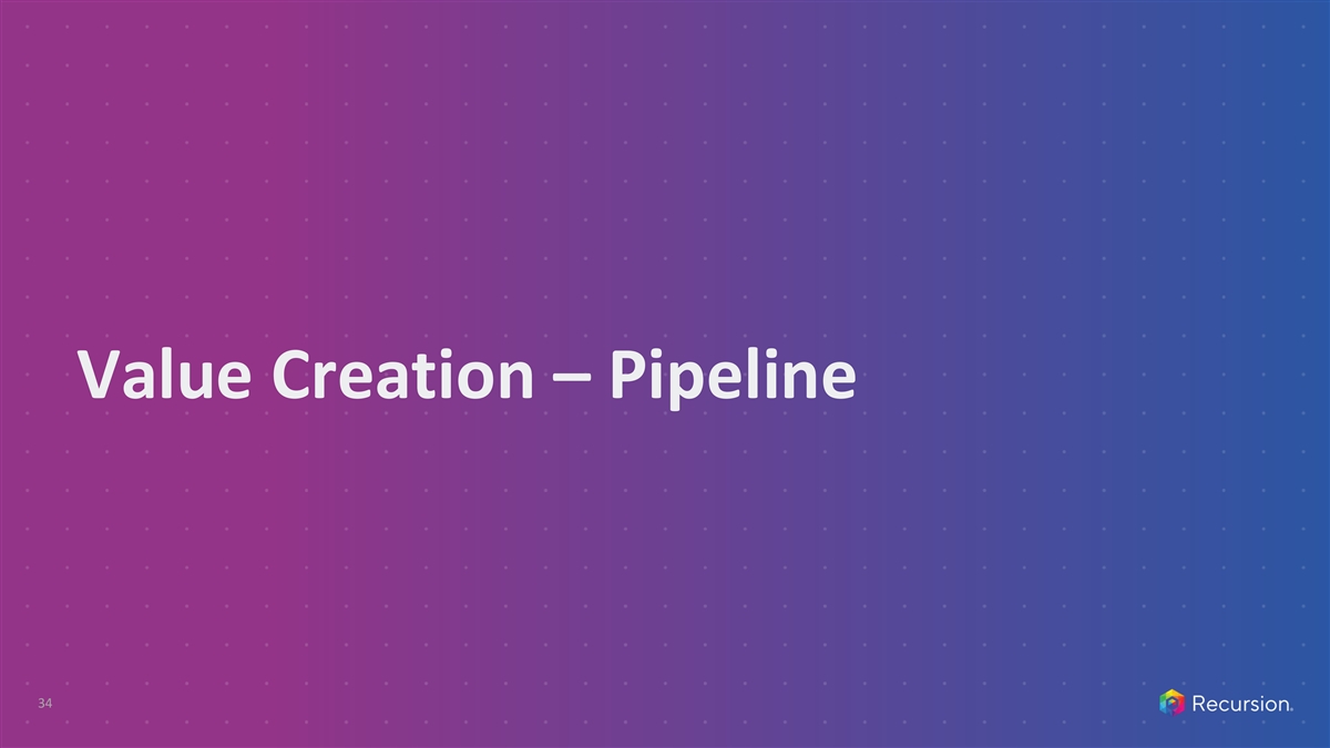 We harness value from the Recursion OS with a multi-pronged capital efficient business strategy Pipeline Strategy Precision Oncology Build internal pipeline in indications with potential for Rare Disease accelerated path to approval Pipeline Partnership Strategy Neuroscience* Partner in complex therapeutic areas Undruggable Oncology requiring large financial commitment or competitive arbitrage Partnerships Other large, intractable areas Leverage partner knowledge and clinical development capabilities of biology (e.g., CV/Met) Data Strategy Licensing License subsets of data and key tools Augment Recursion OS Direct generation of new data Data internally to maximize pipeline and partnership value-drivers *Includes a single oncology indication from our Roche and Genentech collaboration. 33