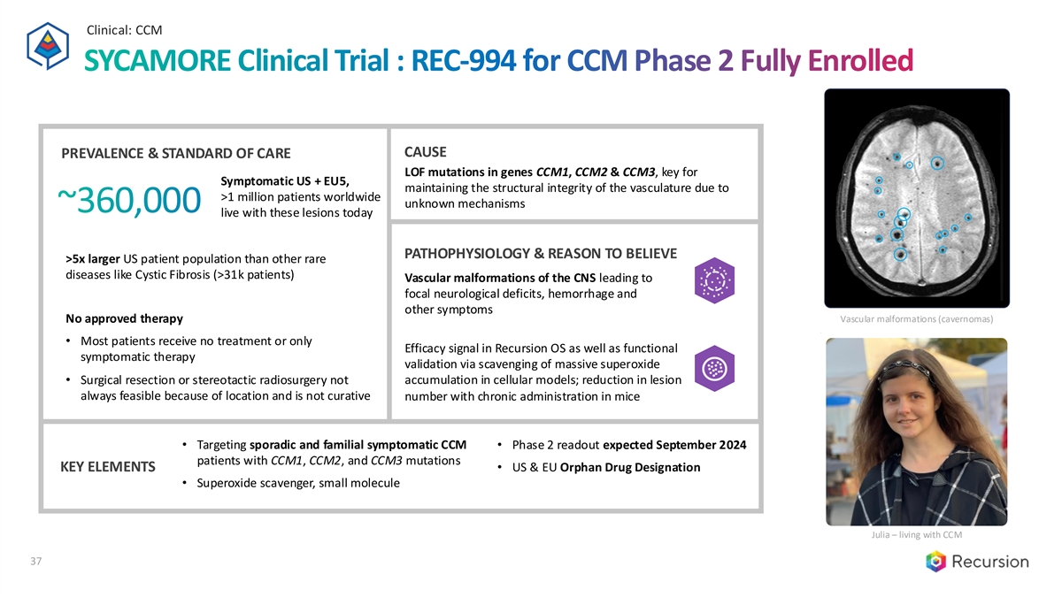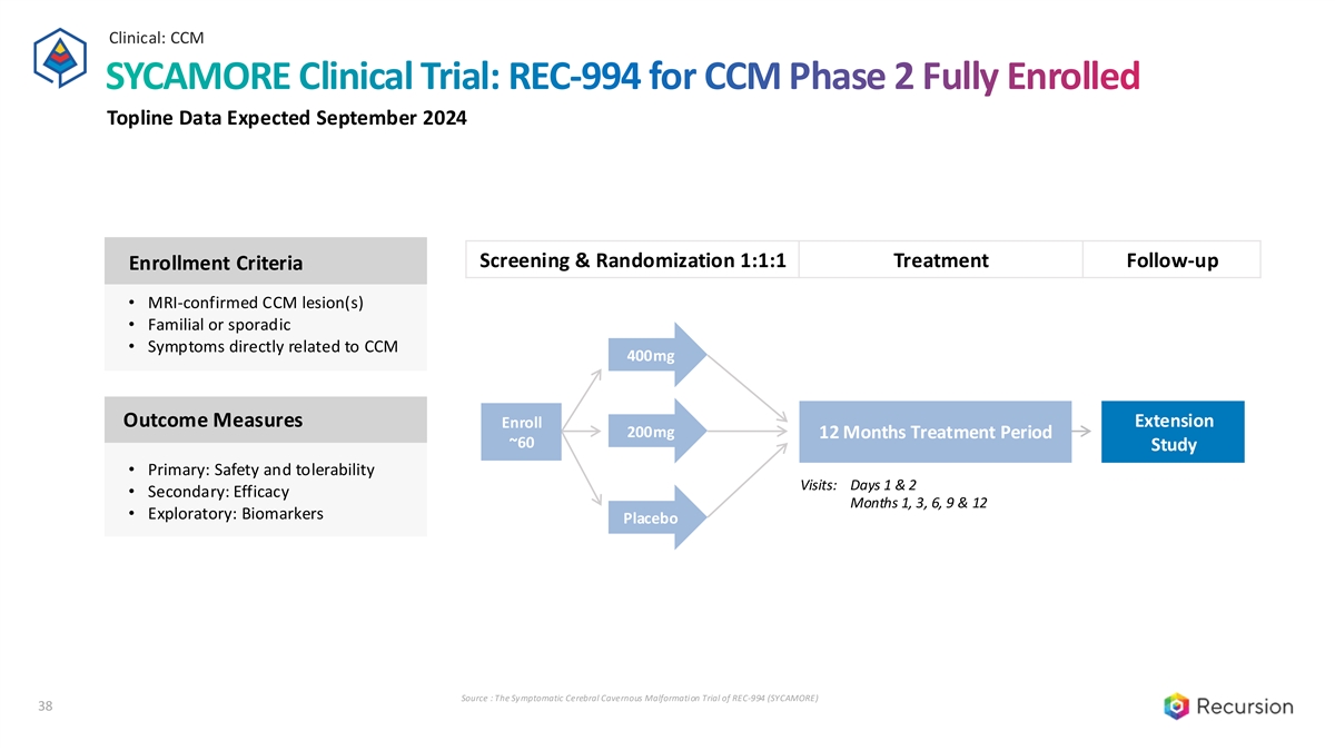 Clinical: CCM SYCAMORE Clinical Trial : REC-994 for CCM Phase 2 Fully Enrolled CAUSE PREVALENCE & STANDARD OF CARE LOF mutations in genes CCM1, CCM2 & CCM3, key for Symptomatic US + EU5, maintaining the structural integrity of the vasculature due to >1 million patients worldwide unknown mechanisms ~360,000 live with these lesions today PATHOPHYSIOLOGY & REASON TO BELIEVE >5x larger US patient population than other rare diseases like Cystic Fibrosis (>31k patients) Vascular malformations of the CNS leading to focal neurological deficits, hemorrhage and other symptoms Vascular malformations (cavernomas) No approved therapy • Most patients receive no treatment or only Efficacy signal in Recursion OS as well as functional symptomatic therapy validation via scavenging of massive superoxide accumulation in cellular models; reduction in lesion • Surgical resection or stereotactic radiosurgery not always feasible because of location and is not curative number with chronic administration in mice • Targeting sporadic and familial symptomatic CCM • Phase 2 readout expected September 2024 patients with CCM1, CCM2, and CCM3 mutations KEY ELEMENTS • US & EU Orphan Drug Designation • Superoxide scavenger, small molecule Julia – living with CCM 37