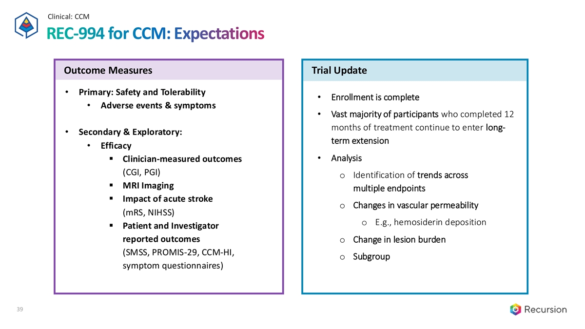 Clinical: CCM SYCAMORE Clinical Trial: REC-994 for CCM Phase 2 Fully Enrolled Topline Data Expected September 2024 Screening & Randomization 1:1:1 Treatment Follow-up Enrollment Criteria • MRI-confirmed CCM lesion(s) • Familial or sporadic • Symptoms directly related to CCM 400mg Outcome Measures Extension Enroll 200mg 12 Months Treatment Period ~60 Study • Primary: Safety and tolerability Visits: Days 1 & 2 • Secondary: Efficacy Months 1, 3, 6, 9 & 12 Trial Update • Exploratory: Biomarkers Placebo Source : The Symptomatic Cerebral Cavernous Malformation Trial of REC-994 (SYCAMORE) 38