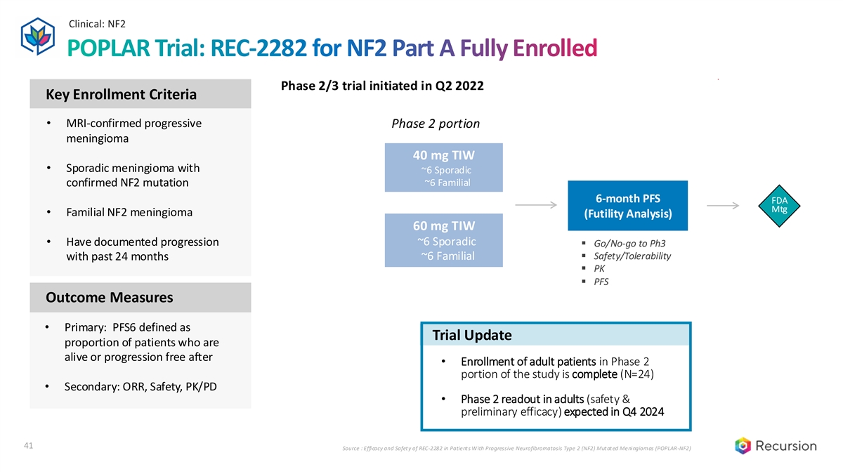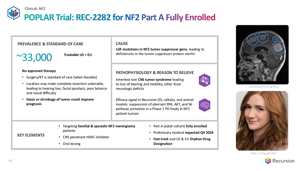 Clinical: NF2 POPLAR Trial: REC-2282 for NF2 Part A Fully Enrolled CAUSE PREVALENCE & STANDARD OF CARE LOF mutations in NF2 tumor suppressor gene, leading to deficiencies in the tumor suppressor protein merlin Treatable US + EU ~33,000 No approved therapy PATHOPHYSIOLOGY & REASON TO BELIEVE • Surgery/RT is standard of care (when feasible) Inherited rare CNS tumor syndrome leading • Location may make complete resection untenable, to loss of hearing and mobility, other focal Intracranial meningiomas leading to hearing loss, facial paralysis, poor balance neurologic deficits and visual difficulty • Stasis or shrinkage of tumor could improve Efficacy signal in Recursion OS, cellular, and animal prognosis models; suppression of aberrant ERK, AKT, and S6 pathway activation in a Phase 1 PD Study in NF2 patient tumors • Targeting familial & sporadic NF2 meningioma • Part A (adult cohort) fully enrolled patients • Preliminary readout expected Q4 2024 KEY ELEMENTS • CNS penetrant HDAC inhibitor • Fast-track and US & EU Orphan Drug • Oral dosing Designation Ricki – living with NF2 40