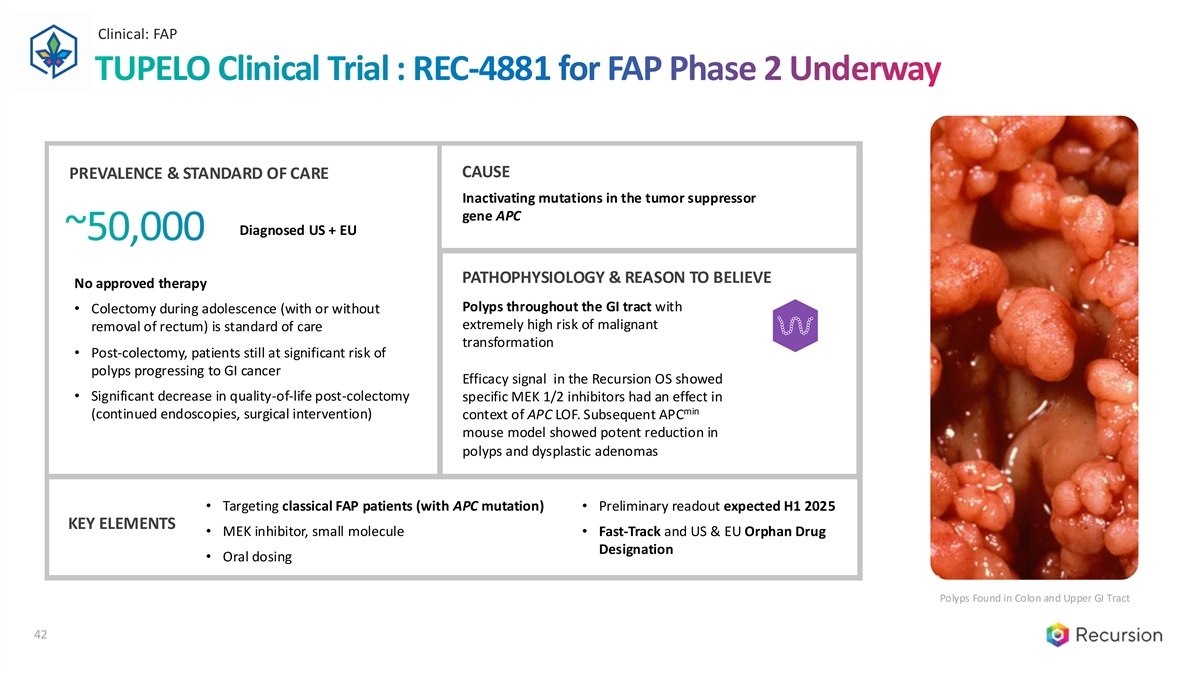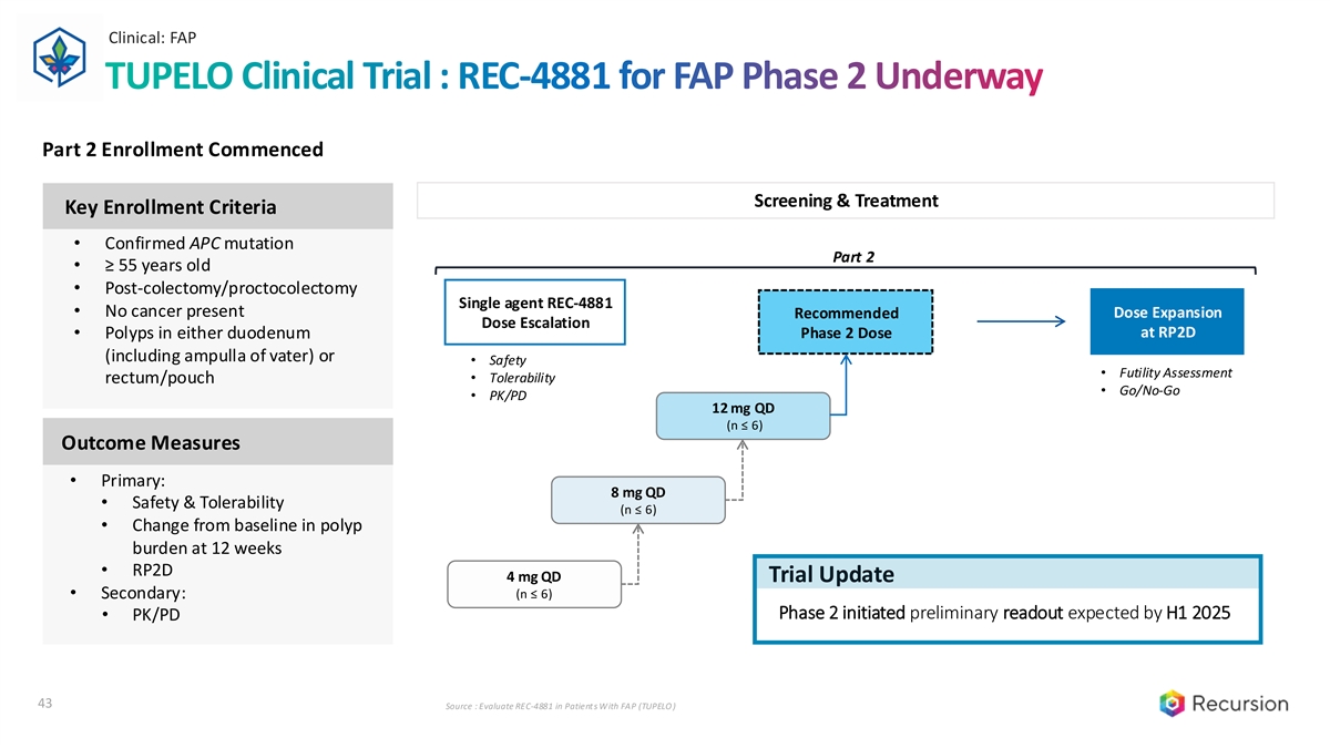 Clinical: FAP TUPELO Clinical Trial : REC-4881 for FAP Phase 2 Underway CAUSE PREVALENCE & STANDARD OF CARE Inactivating mutations in the tumor suppressor gene APC Diagnosed US + EU ~50,000 PATHOPHYSIOLOGY & REASON TO BELIEVE No approved therapy Polyps throughout the GI tract with • Colectomy during adolescence (with or without extremely high risk of malignant removal of rectum) is standard of care transformation • Post-colectomy, patients still at significant risk of polyps progressing to GI cancer Efficacy signal in the Recursion OS showed • Significant decrease in quality-of-life post-colectomy specific MEK 1/2 inhibitors had an effect in min (continued endoscopies, surgical intervention) context of APC LOF. Subsequent APC mouse model showed potent reduction in polyps and dysplastic adenomas • Targeting classical FAP patients (with APC mutation) • Preliminary readout expected H1 2025 KEY ELEMENTS • MEK inhibitor, small molecule • Fast-Track and US & EU Orphan Drug Designation • Oral dosing Polyps Found in Colon and Upper GI Tract 42