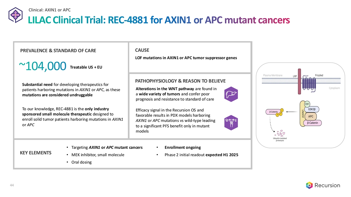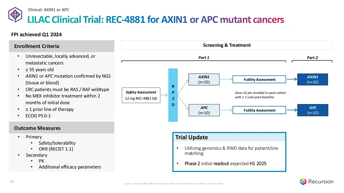 Clinical: AXIN1 or APC LILAC Clinical Trial: REC-4881 for AXIN1 or APC mutant cancers CAUSE PREVALENCE & STANDARD OF CARE LOF mutations in AXIN1 or APC tumor suppressor genes Treatable US + EU ~104,000 PATHOPHYSIOLOGY & REASON TO BELIEVE Substantial need for developing therapeutics for Alterations in the WNT pathway are found in patients harboring mutations in AXIN1 or APC, as these a wide variety of tumors and confer poor mutations are considered undruggable prognosis and resistance to standard of care To our knowledge, REC-4881 is the only industry Efficacy signal in the Recursion OS and sponsored small molecule therapeutic designed to favorable results in PDX models harboring enroll solid tumor patients harboring mutations in AXIN1 AXIN1 or APC mutations vs wild-type leading or APC to a significant PFS benefit only in mutant models • Targeting AXIN1 or APC mutant cancers • Enrollment ongoing AXIN1/APC regulate WNT signaling KEY ELEMENTS • MEK inhibitor, small molecule • Phase 2 initial readout expected H1 2025 • Oral dosing 44