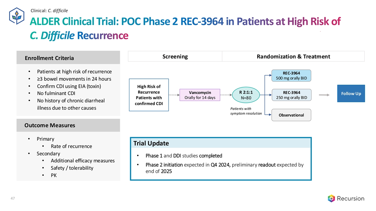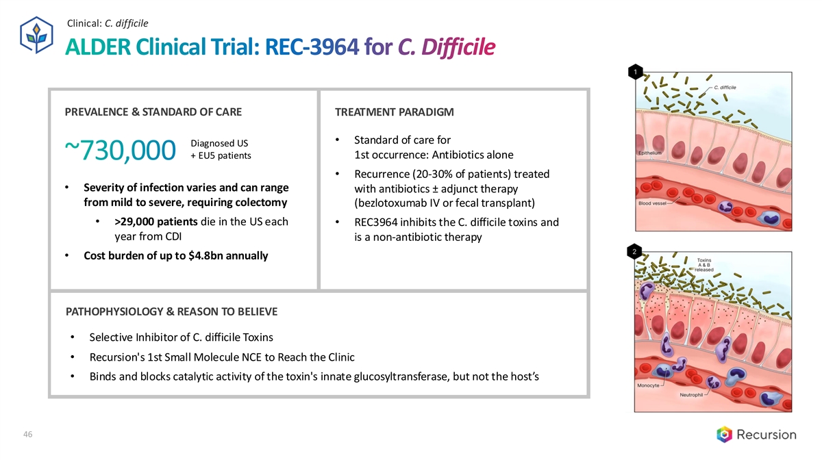 Clinical: C. difficile ALDER Clinical Trial: REC-3964 for C. Difficile PREVALENCE & STANDARD OF CARE TREATMENT PARADIGM • Standard of care for Diagnosed US 1st occurrence: Antibiotics alone + EU5 patients ~730,000 • Recurrence (20-30% of patients) treated • Severity of infection varies and can range with antibiotics ± adjunct therapy from mild to severe, requiring colectomy (bezlotoxumab IV or fecal transplant) • >29,000 patients die in the US each • REC3964 inhibits the C. difficile toxins and year from CDI is a non-antibiotic therapy • Cost burden of up to $4.8bn annually PATHOPHYSIOLOGY & REASON TO BELIEVE • Selective Inhibitor of C. difficile Toxins PATHOPHYSIOLOGY & REASON TO BELIEVE • Recursion's 1st Small Molecule NCE to Reach the Clinic • Binds and blocks catalytic activity of the toxin's innate glucosyltransferase, but not the host’s 46