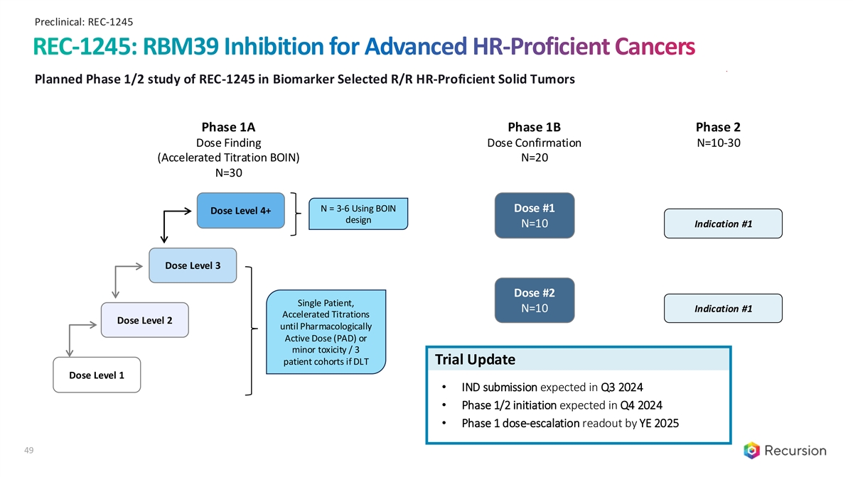 Preclinical: REC-1245 REC-1245: RBM39 Inhibition for Advanced HR-Proficient Cancers Identify tumor-targeted precision therapeutic NCE with novel MOA capable GOAL of potentially treating HR-proficient cancers CDK12 Inhibition of target RBM39 (previously referred to as Target γ) may mimic the Similar INSIGHT FROM OS RBM39 inhibition of CDK12 while mitigating toxicity related to CDK13 inhibition 2.5 µM 1.0 µM A Recursion-generated NCE showed single agent efficacy that is enhanced in FURTHER CONFIDENCE REC-1170204 0.25 µM combination with Niraparib in a BRCA-proficient PDX model 0.1 µM Opposite IND submission in Q3 2024 with Phase 1/2 dose finding / confirmation study NEXT STEPS CDK13 expected to initiate in Q4 2024 OV0273 (PDX) in-vivo efficacy Survival data Vehicle Niraparib BRCA-proficient ovarian cancer PDX REC-204 100 mpk REC-204 100 mpk + Niraparib 48 Note: in the OV0273 PDX model, mice were treated with a representative lead molecule REC-1170204 (100 mg/kg, BID, PO) ± Niraparib (40 mg/kg, QD, PO) for 28 days. Single agent REC-1170204 or in combination with Niraparib resulted in a statistically significant response vs either Niraparib or vehicle arms. In addition, there was a statistically significant improvement in survival > 30 days post final dose. *p<0.05, ** p<0.01, **** p<0.0001