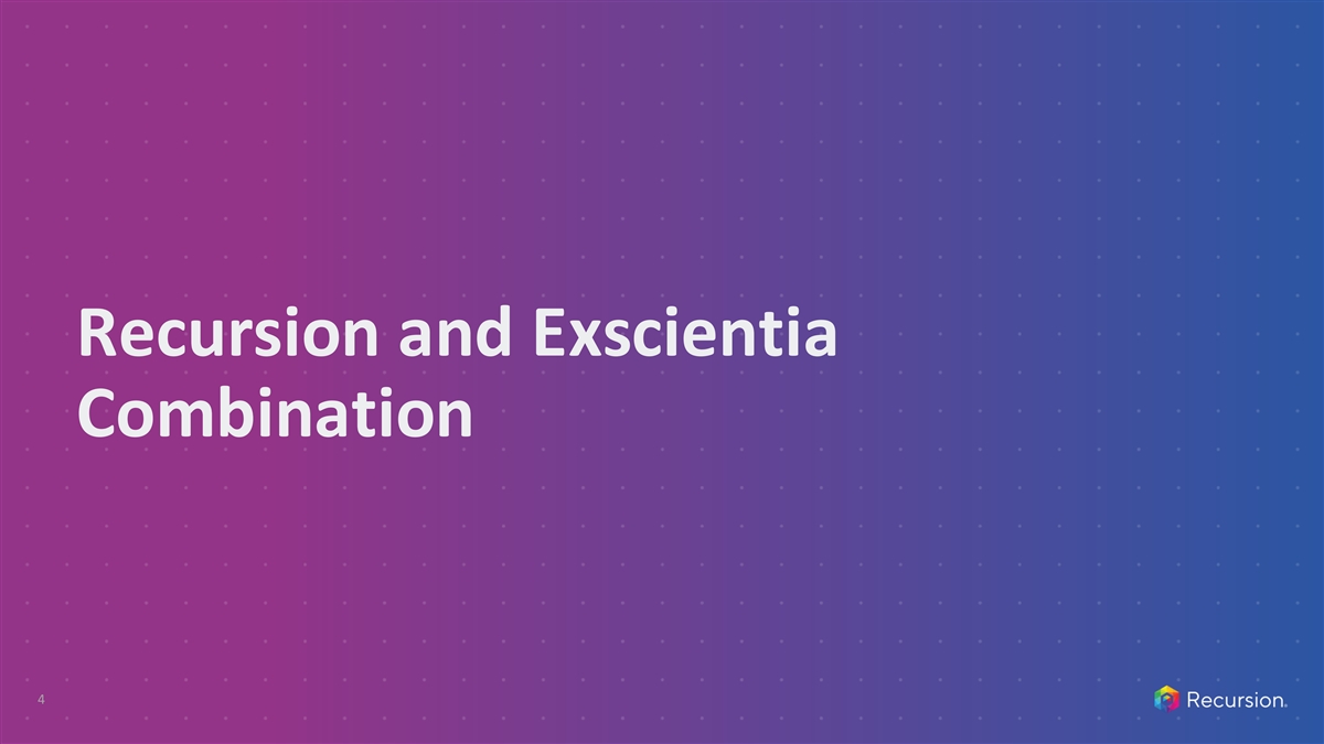 Important Information (continued) Certain information contained in this presentation relates to or is based on studies, publications, surveys and other data obtained from third-party sources and the company’s own internal estimates and research. While the company believes these third-party sources to be reliable as of the date of this presentation, it has not independently verified, and makes no representation as to the adequacy, fairness, accuracy or completeness of, any information obtained from third-party sources. In addition, all of the market data included in this presentation involves a number of assumptions and limitations, and there can be no guarantee as to the accuracy or reliability of such assumptions. Finally, while the company believes its own internal research is reliable, such research has not been verified by any independent source. Information contained in, or that can be accessed through our website is not a part of and is not incorporated into this presentation. Cross-trial or cross-candidate comparisons against other clinical trials and other drug candidates are not based on head-to-head studies and are presented for informational purposes; comparisons are based on publicly available information for other clinical trials and other drug candidates. Any non-Recursion logos or trademarks included herein are the property of the owners thereof and are used for reference purposes only. Additional Information and Where to Find It This communication relates to the proposed business combination of Recursion and Exscientia that will become the subject of a joint proxy statement to be filed by Recursion and Exscientia with the SEC. The joint proxy statement will provide full details of the proposed combination and the attendant benefits and risks. This communication is not a substitute for the joint proxy statement or any other document that Recursion or Exscientia may file with the SEC or send to their respective security holders in connection with the proposed transaction. Security holders are urged to read the definitive joint proxy statement and all other relevant documents filed with the SEC or sent toRecursion’s stockholders or Exscientia’s shareholders as they become available because they will contain important information about the proposed transaction. All documents, when filed, will be available free of charge at the SEC’s website (www.sec.gov). You may also obtain these documents by contacting Recursion’s Investor Relations department at investor@recursion.com; or by contacting Exscientia’s Investor Relations department at investors@exscientia.ai. This communication does not constitute an offer to sell or the solicitation of an offer to buy any securities or a solicitation of any vote or approval. Participants in the Solicitation Recursion, Exscientia and their respective directors and executive officers may be deemed to be participants in any solicitation of proxies in connection with the proposed business combination. Information about Recursion’s directors and executive officers is available in Recursion’s proxy statement dated April 23, 2024 for its 2024 Annual Meeting of Stockholders. Information about Exscientia’s directors and executive officers is available in Exscientia’s Annual Report on Form 20-F dated March 21, 2024. Other information regarding the participants in the proxy solicitation and a description of their direct and indirect interests, by security holdings or otherwise, will be contained in the joint proxy statement and all other relevant materials to be filed with the SEC regarding the proposed combination when they become available. Investors should read the joint proxy statement carefully when it becomes available before making any voting or investment decisions. 3