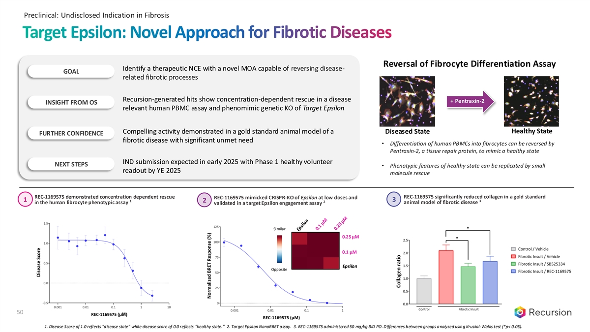 Preclinical: Undisclosed Indication in Fibrosis Target Epsilon: Novel Approach for Fibrotic Diseases Reversal of Fibrocyte Differentiation Assay Identify a therapeutic NCE with a novel MOA capable of reversing disease- GOAL related fibrotic processes Recursion-generated hits show concentration-dependent rescue in a disease + Pentraxin-2 INSIGHT FROM OS relevant human PBMC assay and phenomimic genetic KO of Target Epsilon Healthy State Compelling activity demonstrated in a gold standard animal model of a Diseased State FURTHER CONFIDENCE fibrotic disease with significant unmet need • Differentiation of human PBMCs into fibrocytes can be reversed by Pentraxin-2, a tissue repair protein, to mimic a healthy state IND submission expected in early 2025 with Phase 1 healthy volunteer NEXT STEPS • Phenotypic features of healthy state can be replicated by small readout by YE 2025 molecule rescue REC-1169575 demonstrated concentration dependent rescue REC-1169575 significantly reduced collagen in a gold standard REC-1169575 mimicked CRISPR-KO of Epsilon at low doses and 3 1 1 3 2 2 in the human fibrocyte phenotypic assay animal model of fibrotic disease validated in a target Epsilon engagement assay Similar 0.25 µM 0.1 µM Epsilon Opposite 50 1. Disease Score of 1.0 reflects “disease state” while disease score of 0.0 reflects “healthy state.” 2. Target Epsilon NanoBRET assay. 3. REC-1169575 administered 50 mg/kg BID PO. Differences between groups analyzed using Kruskal-Wallis test (*p< 0.05).