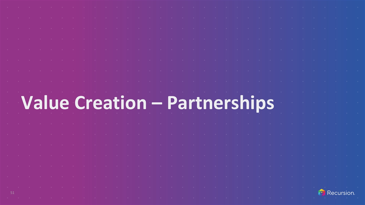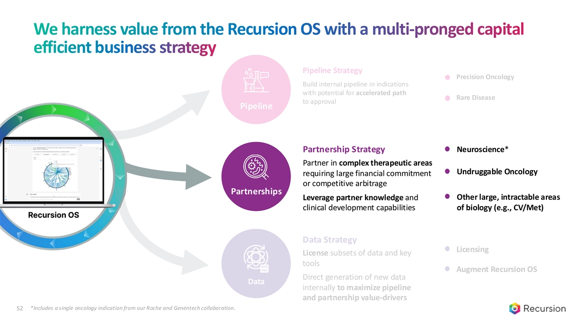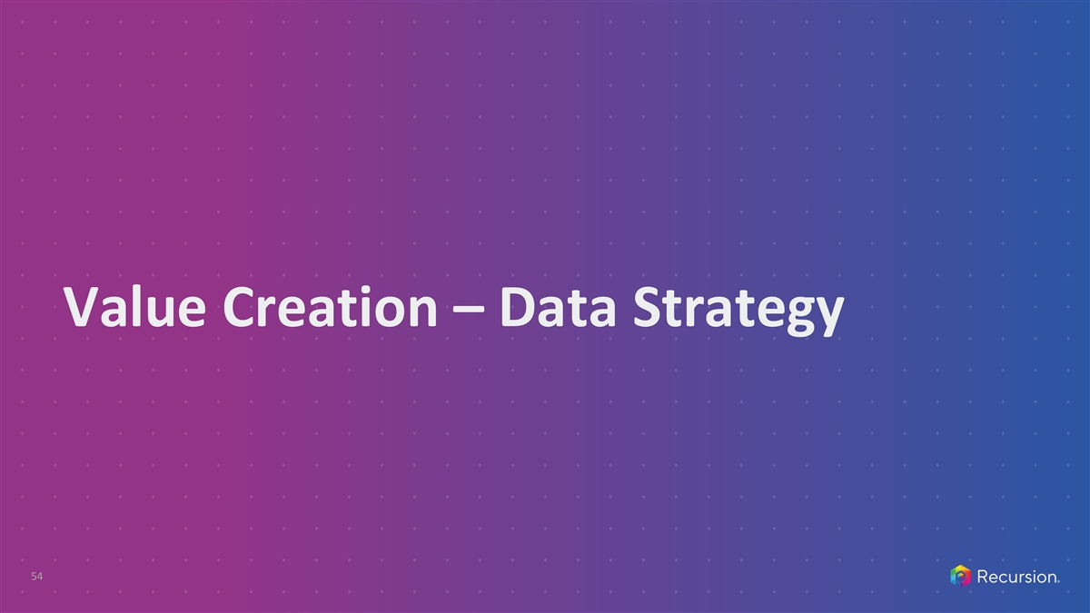We harness value from the Recursion OS with a multi-pronged capital efficient business strategy Pipeline Partnership Strategy Neuroscience* Partner in complex therapeutic areas Undruggable Oncology requiring large financial commitment or competitive arbitrage Partnerships Other large, intractable areas Leverage partner knowledge and clinical development capabilities of biology (e.g., CV/Met) Data *Includes a single oncology indication from our Roche and Genentech collaboration. 52