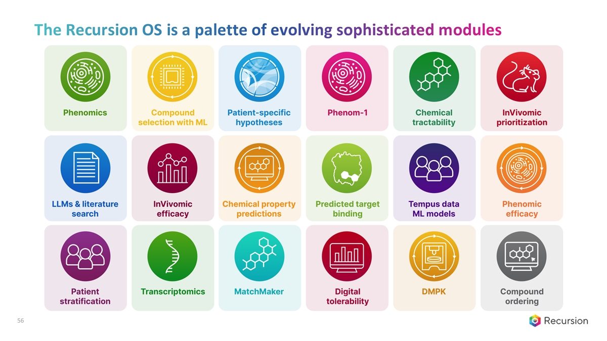 We harness value from the Recursion OS with a multi-pronged capital efficient business strategy Pipeline Partnerships Data Strategy Licensing License subsets of data and key tools Augment Recursion OS Direct generation of new data Data internally to maximize pipeline and partnership value-drivers *Includes a single oncology indication from our Roche and Genentech collaboration. 55
