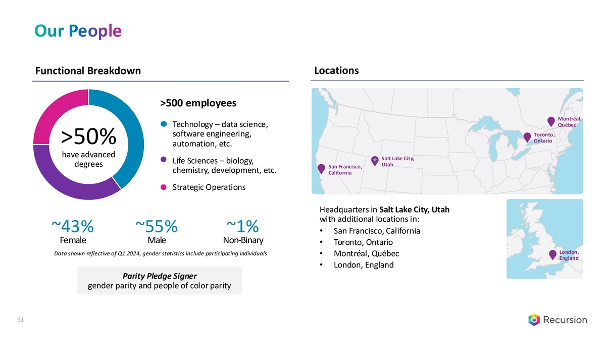 Our People Functional Breakdown Locations >500 employees Montréal, Québec Technology – data science, software engineering, Toronto, Ontario >50% automation, etc. have advanced Salt Lake City, Life Sciences – biology, Utah degrees San Francisco, chemistry, development, etc. California Strategic Operations Headquarters in Salt Lake City, Utah with additional locations in: ~43% ~55% ~1% • San Francisco, California Female Male Non-Binary • Toronto, Ontario London, Data shown reflective of Q1 2024, gender statistics include participating individuals • Montréal, Québec England • London, England Parity Pledge Signer gender parity and people of color parity 61