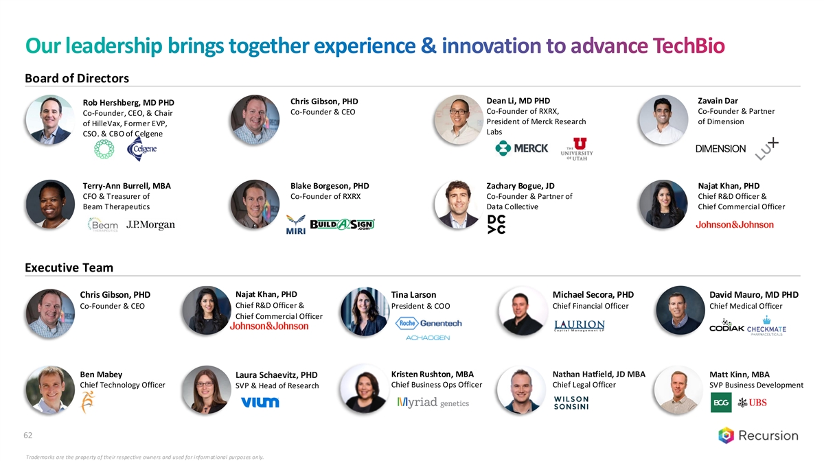 Our leadership brings together experience & innovation to advance TechBio Board of Directors Dean Li, MD PHD Zavain Dar Chris Gibson, PHD Rob Hershberg, MD PHD Co-Founder of RXRX, Co-Founder & Partner Co-Founder & CEO Co-Founder, CEO, & Chair President of Merck Research of Dimension of HilleVax, Former EVP, Labs CSO, & CBO of Celgene Terry-Ann Burrell, MBA Blake Borgeson, PHD Zachary Bogue, JD Najat Khan, PHD CFO & Treasurer of Co-Founder of RXRX Co-Founder & Partner of Chief R&D Officer & Beam Therapeutics Data Collective Chief Commercial Officer Executive Team Chris Gibson, PHD Najat Khan, PHD Tina Larson Michael Secora, PHD David Mauro, MD PHD Chief R&D Officer & Co-Founder & CEO President & COO Chief Financial Officer Chief Medical Officer Chief Commercial Officer Ben Mabey Kristen Rushton, MBA Nathan Hatfield, JD MBA Matt Kinn, MBA Laura Schaevitz, PHD Chief Technology Officer Chief Business Ops Officer Chief Legal Officer SVP Business Development SVP & Head of Research 62 Trademarks are the property of their respective owners and used for informational purposes only.