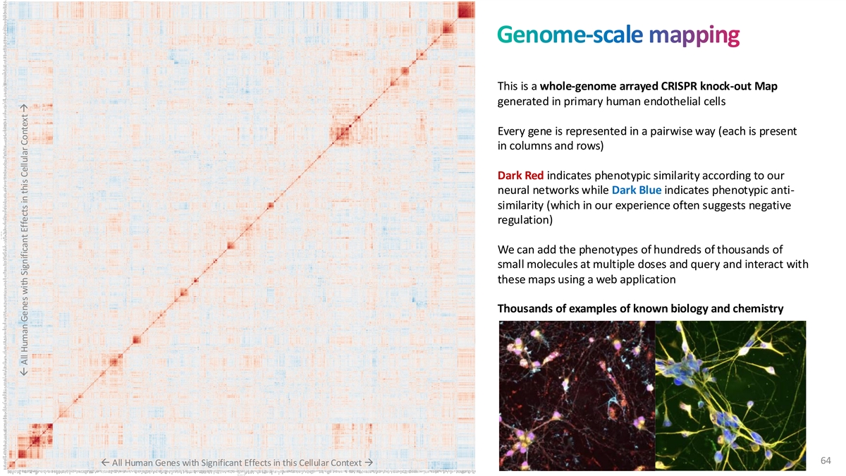 Genome-scale mapping This is a whole-genome arrayed CRISPR knock-out Map generated in primary human endothelial cells Every gene is represented in a pairwise way (each is present in columns and rows) Dark Red indicates phenotypic similarity according to our neural networks while Dark Blue indicates phenotypic anti- similarity (which in our experience often suggests negative regulation) We can add the phenotypes of hundreds of thousands of small molecules at multiple doses and query and interact with these maps using a web application Thousands of examples of known biology and chemistry 64 ß All Human Genes with Significant Effects in this Cellular Context → ß All Human Genes with Significant Effects in this Cellular Context →